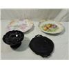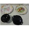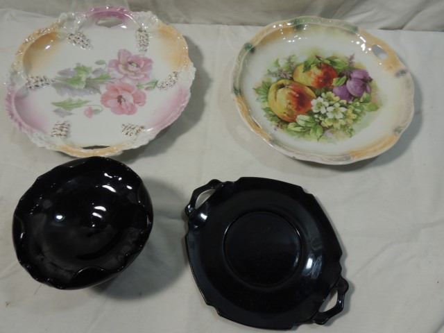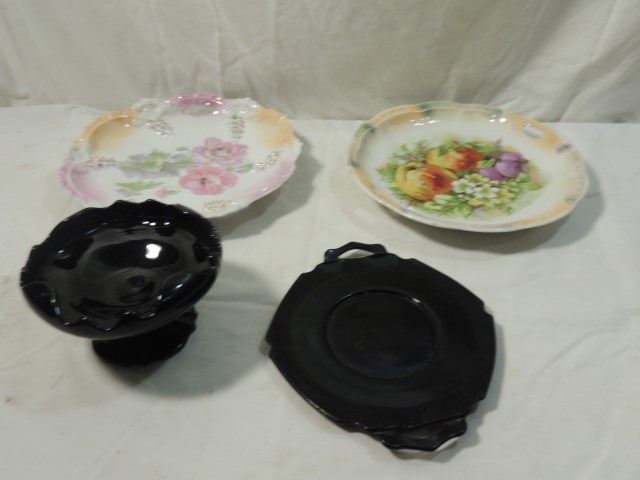 TWO HAND PAINTED LIMOGE OR GERMAN PLATES, AND TWO NICE PIECES OF BLACK AMETHYST GLASS, BOWL AND PLATE. ALL FOR ONE MONEY.