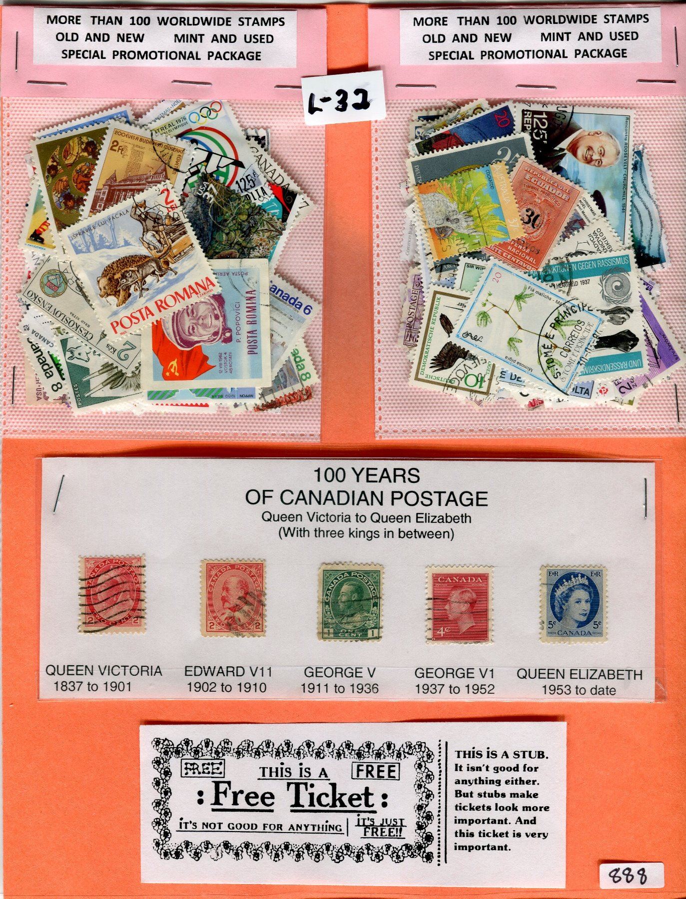 LOT INCLUDING 2-100 STAMP PACKAGES AND 5 STAMPS REPRESENTING 100 YEARS OF CANADA POSTAGE