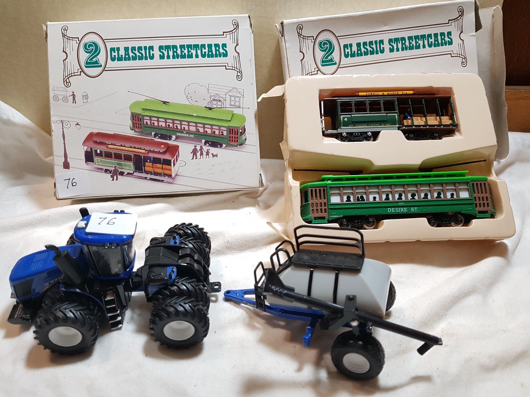 LOT INCLUDING, 2 BOXES OF STREET CARS, DIE CAST TRACTOR AND TANK
