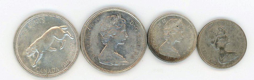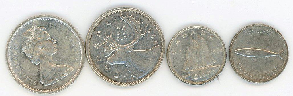 LOT INCLUDING 2-TWENTY FIVE CENT COINS AND 2-TEN CENT COINS (CANADA) *1967-68*