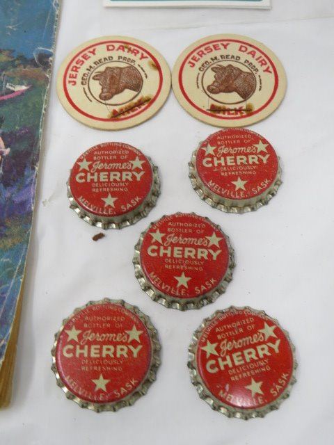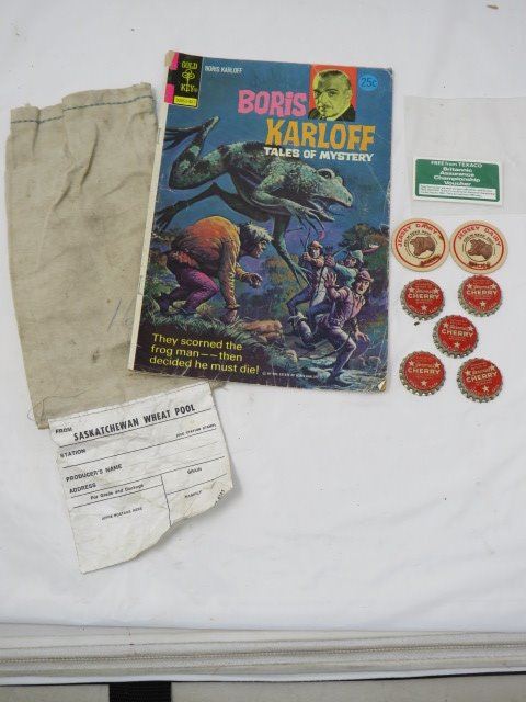 LOT INCLUDING COMIC BOOK, TEXACO VOUCHERS, MILK CAPS, BOTTLECAPS.