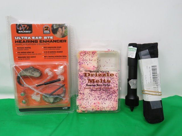 LOT INCLUDING DRIZZLE MELTS, HEARING ENHANCER, BORE SIGHTING KIT