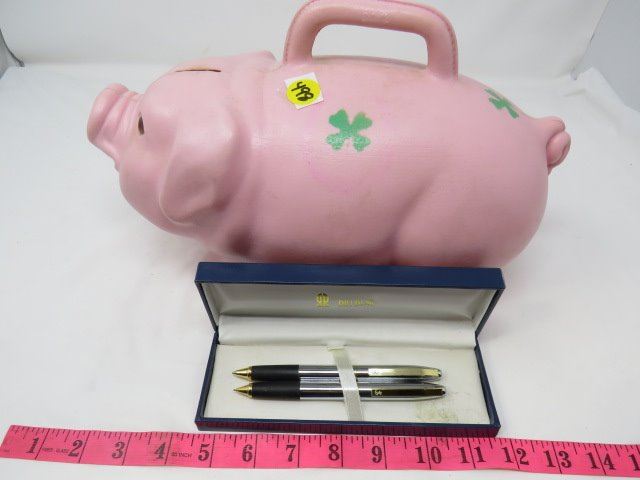 LOT INCLUDING PIGGY BANK AND 2 PENS (BILLBLASS PENS)
