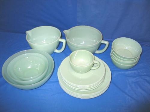 LOT, JADEITE KITCHEN WARE, (2) BATTER BOWLS, (3) MIXING BOWLS, (5) SOUP BOWLS, (6) PLATES, (6) SALAD PLATES, (1) CUP