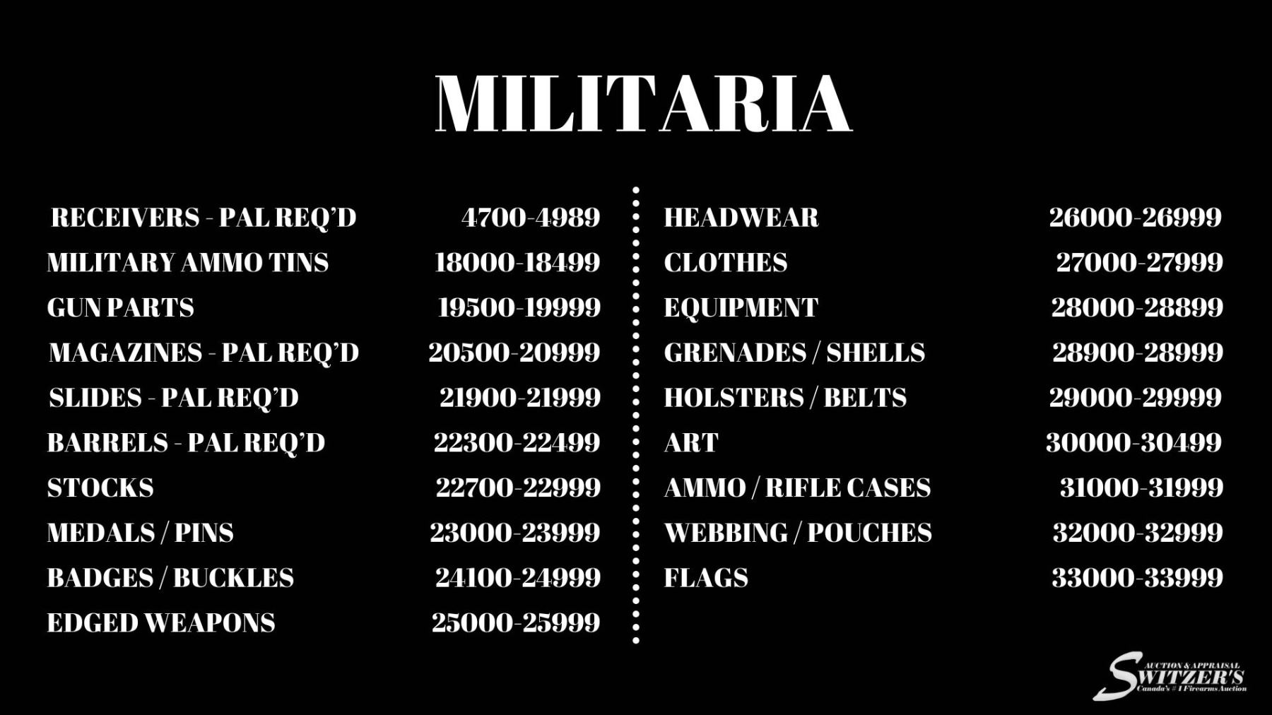 BIDDER REGISTRATION: As we are selling Firearms, Ammunition and Cartridge Magazines, it is imperative that bidders/customers provide us their correct information. We require your full name as shown on your PAL, license number, date of birth, mailing address that is associated with your PAL. When this information is incorrect it will cause a delay in both the processing and shipping of your purchase. If you have made an error and need to correct it, email admin@switzersauction.com.
