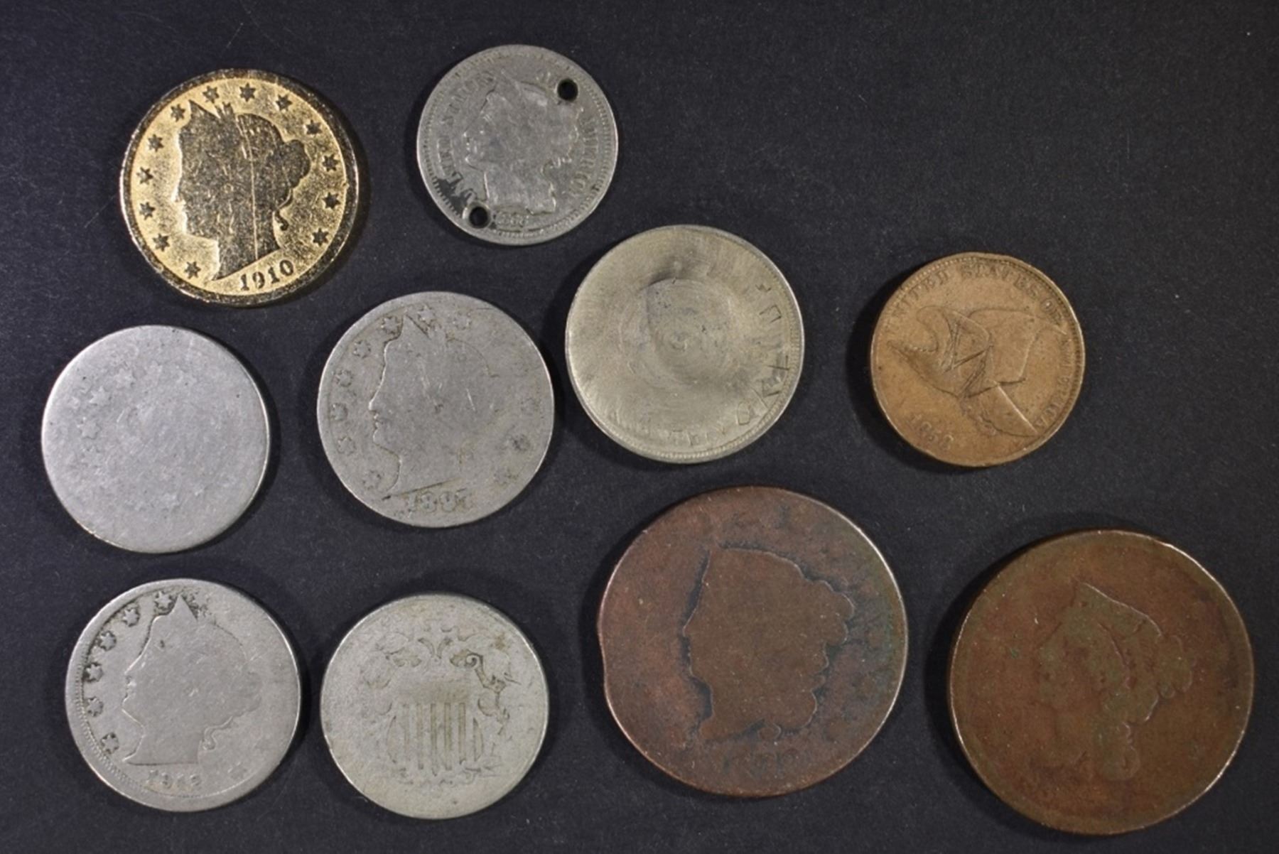 2 - LARGE CENTS, 4 "V" NICKELS, THREE CENT NICKEL, 2 - SHIELD NICKELS, AND 1 FLYING EAGLE ESTIMATE $45 - $65.