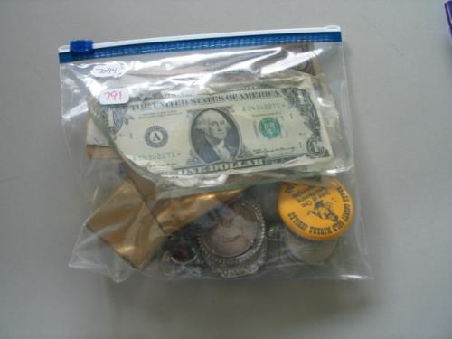 LOT, MISC. JEWELRY, TOKENS, SILVER DOLLAR BUCKLE, (2) METAL BOXES & PAPER MONEY