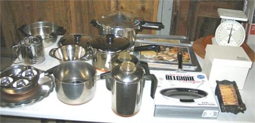 LOT, MISC. KITCHEN SUPPLIES: BAKING SHEETS, CAKE FRAMES, PIE PANS, SIFTERS, STRAINERS, COFFEE POTS, PANS, PORTION SCALE & SERVING STANDS
