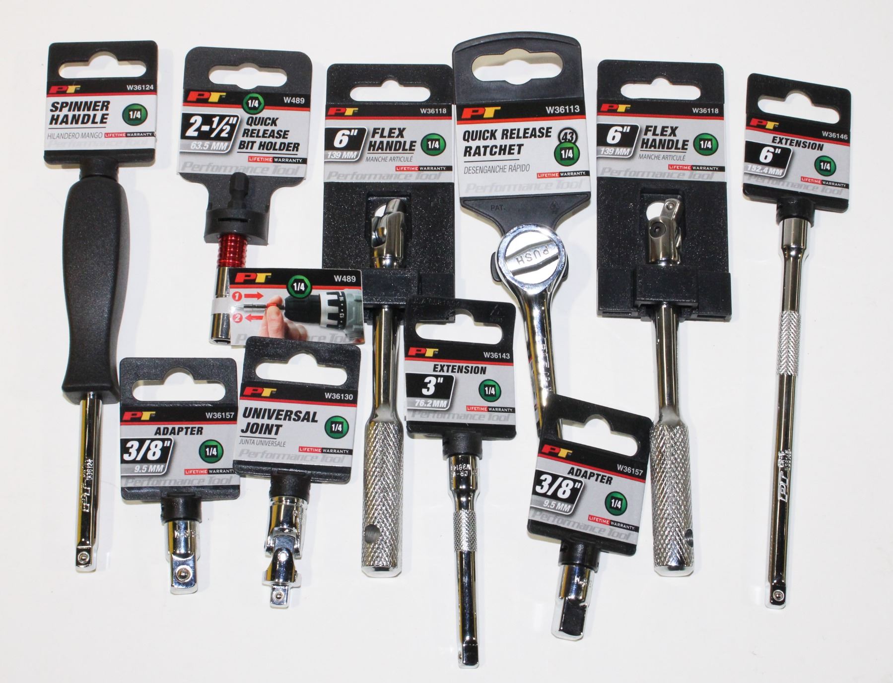 LOT OF 1/4" DRIVE RATCHETS, EXTENSIONS, ADAPTERS,