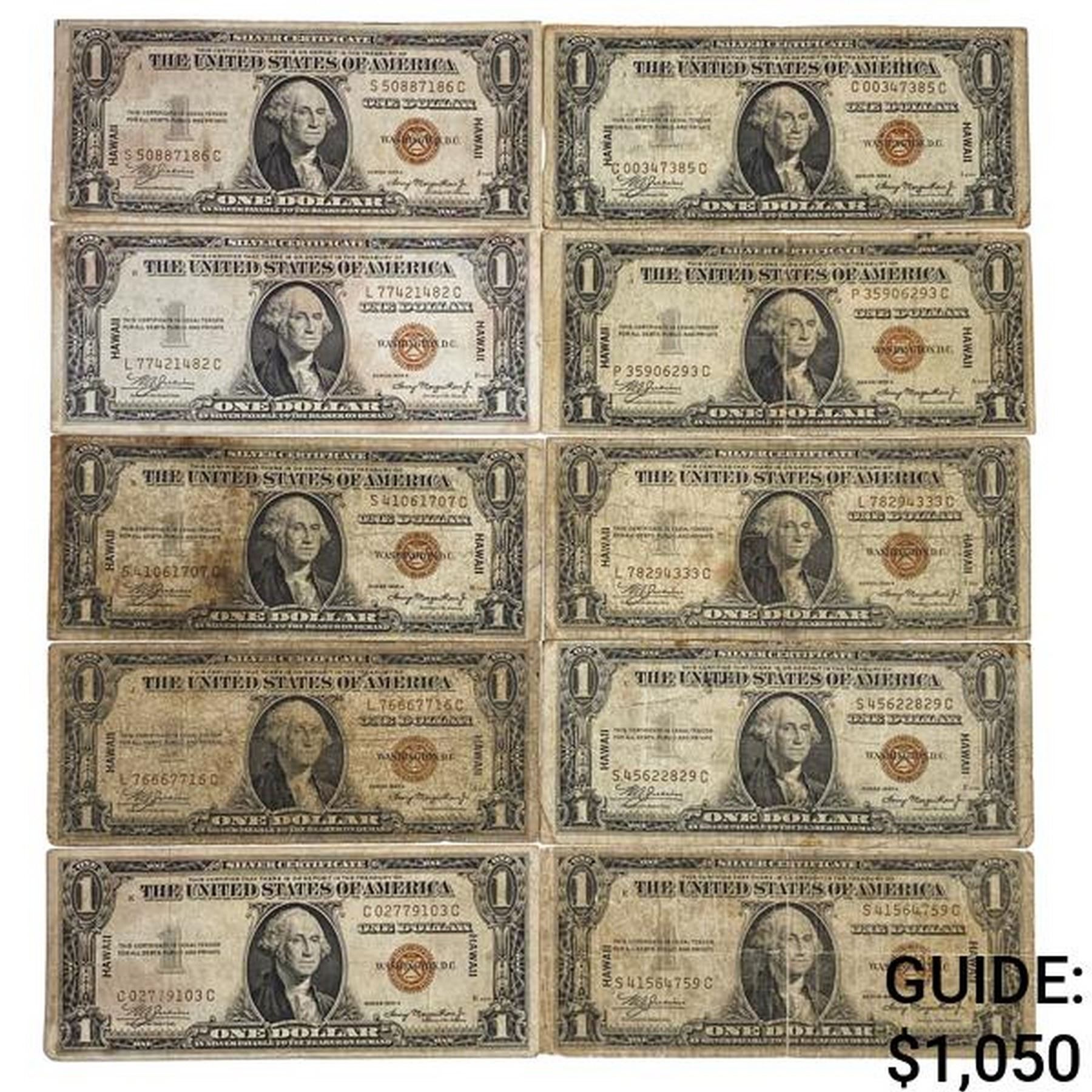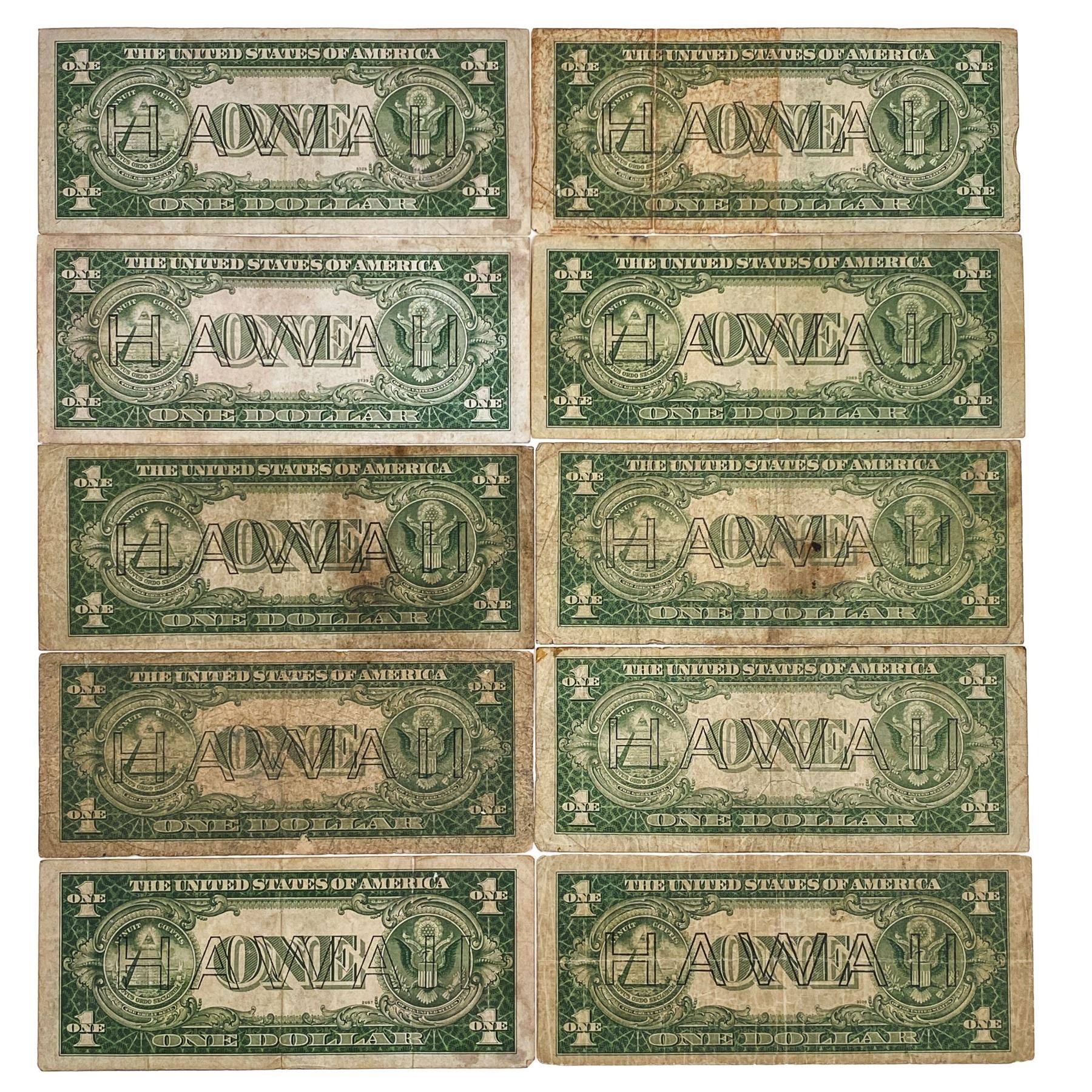 LOT OF (10) 1935-A $1 ONE DOLLAR HAWAII SILVER CERTIFICATES VERY GOOD - VERY FINE