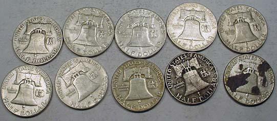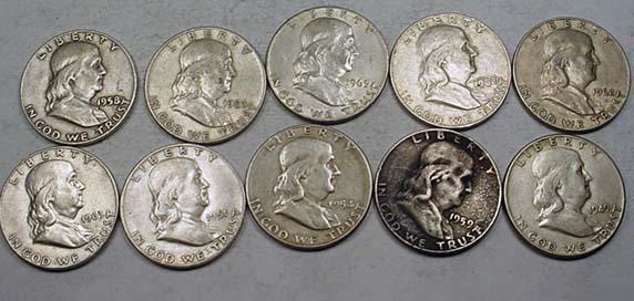 LOT OF 10 90% SILVER FRANKLIN HALF DOLLARS - 1964 OR EARLIER - UNSEARCHED!!