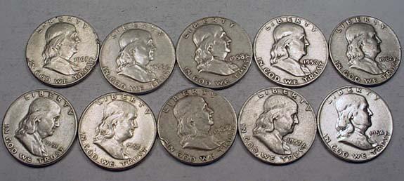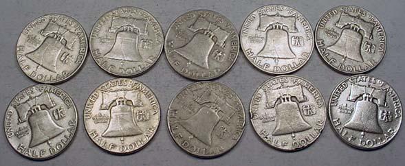 LOT OF 10 90% SILVER FRANKLIN HALF DOLLARS - 1964 OR EARLIER - UNSEARCHED!!
