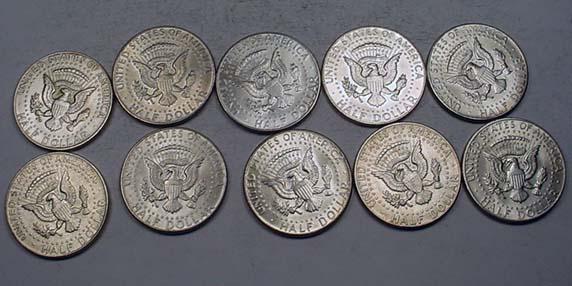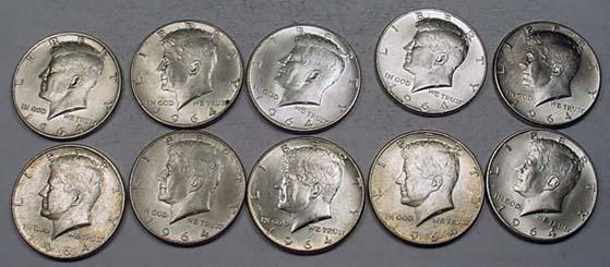 LOT OF 10 90% SILVER KENNEDY HALF DOLLARS - 1964 OR EARLIER - UNSEARCHED!!