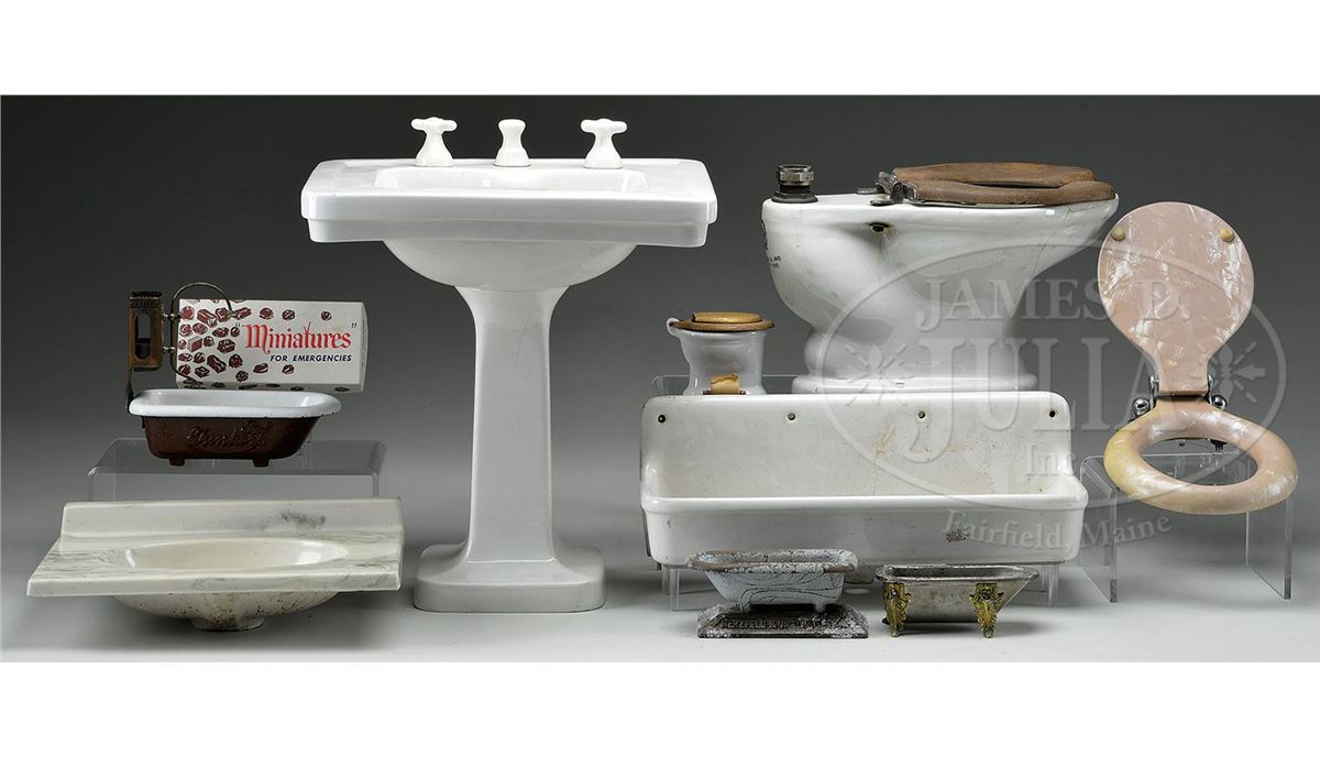 Lot includes unmarked, undrilled sink basin, pink pearlescent seat cover, "Ariston" commode, cast iron wall mount urinal basin, Herzfeld & Victoria cast iron tub, unmarked ceramic toilet, Professor Tunkers porcelain tub with copper tank and head, cast iron claw foot tub by Booth with brass feet, large two part pedestal sink and a novelty box of mini toilet paper. SIZE: Largest 14" w x 17" h x 11" d. CONDITION: Overall lot is very good to excellent excepting the Herzfeld tub is deteriorating and Ariston commode had been repaired. 1-13578
