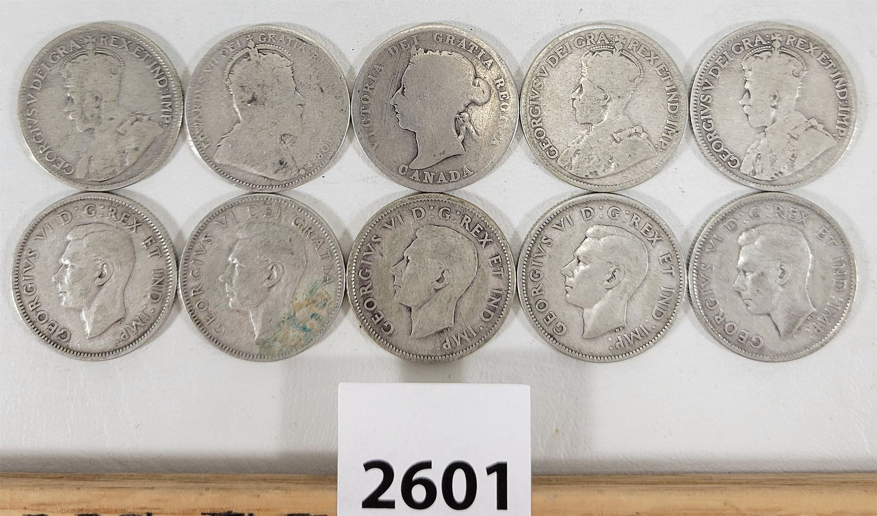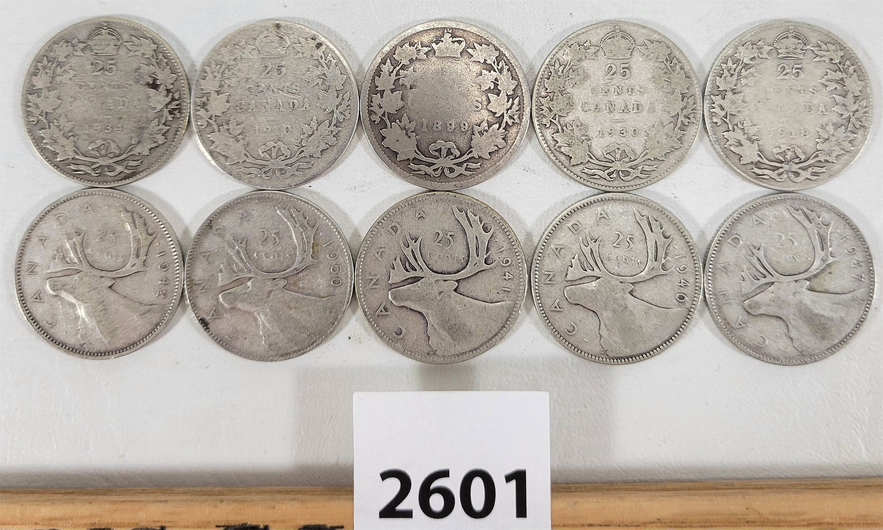 LOT OF 10 - CDN SILVER 25 CENT PIECES - 1899-1950
