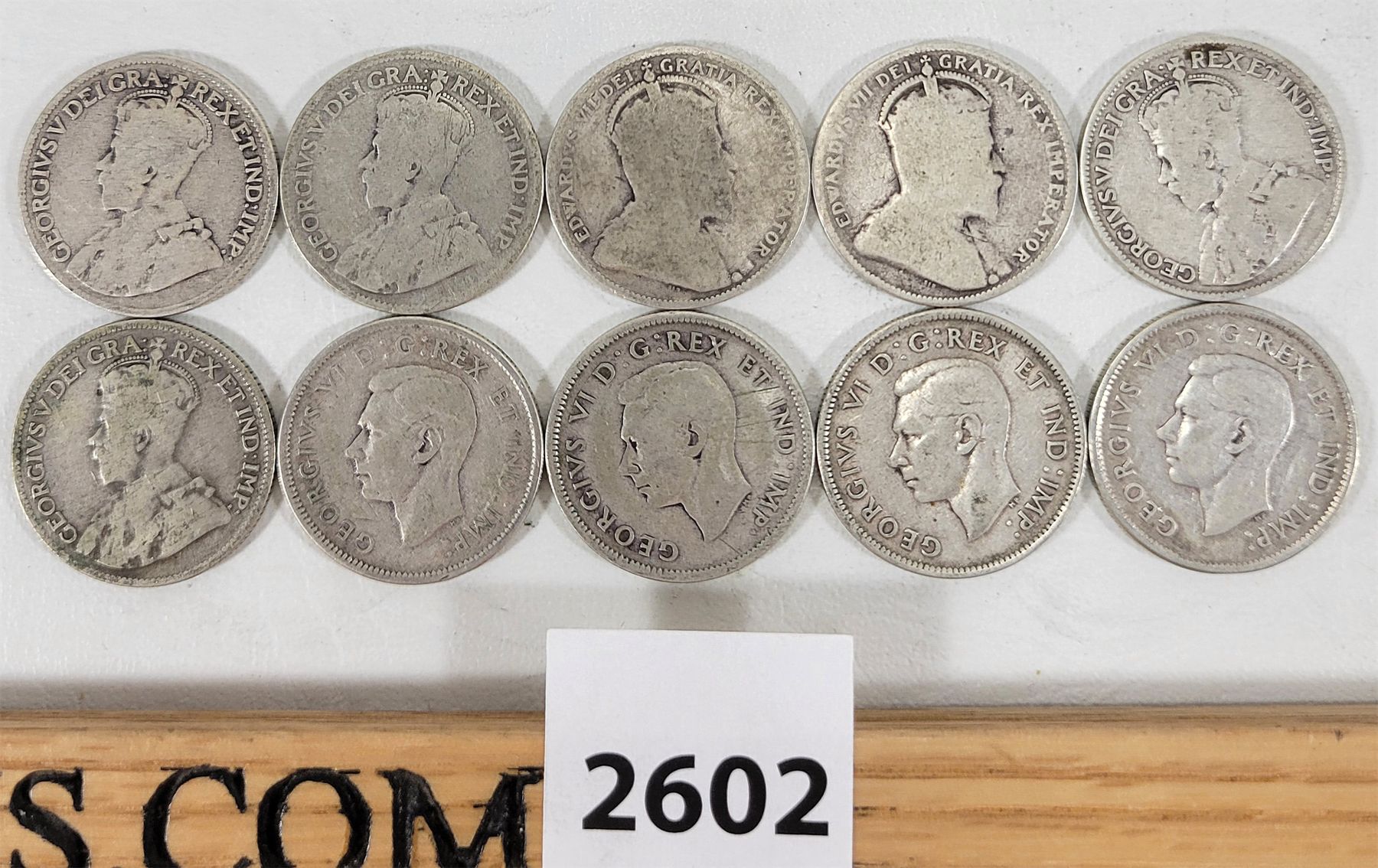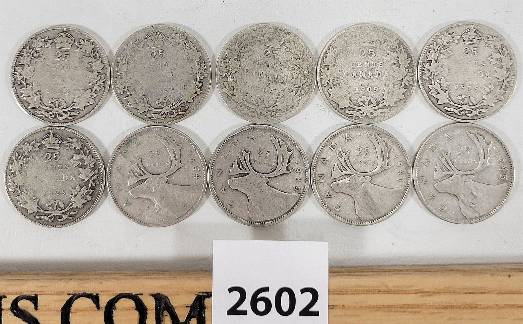 LOT OF 10 - CDN SILVER 25 CENT PIECES - 1909-1945