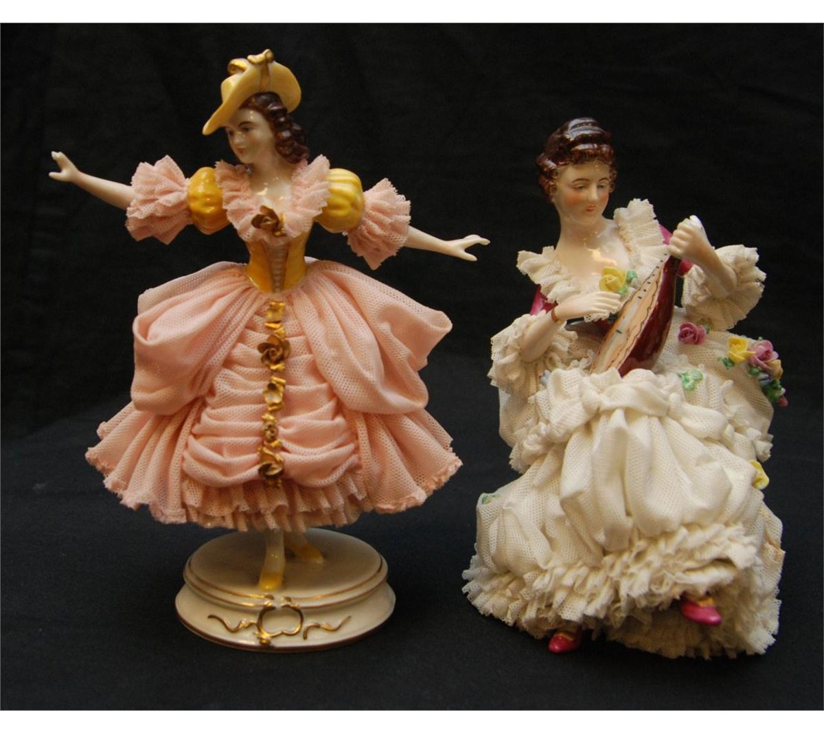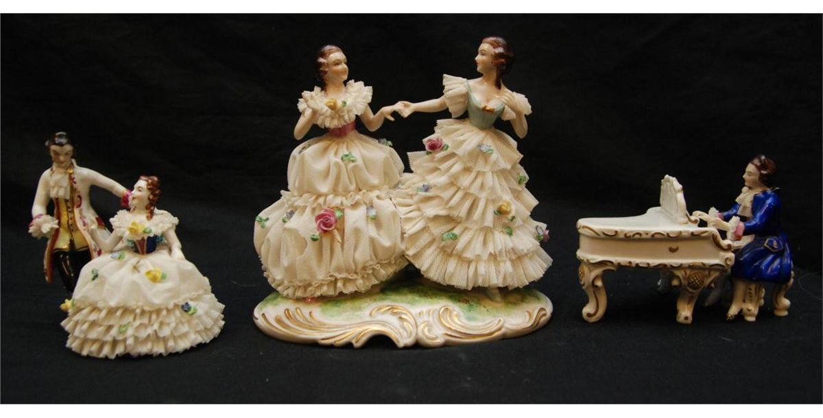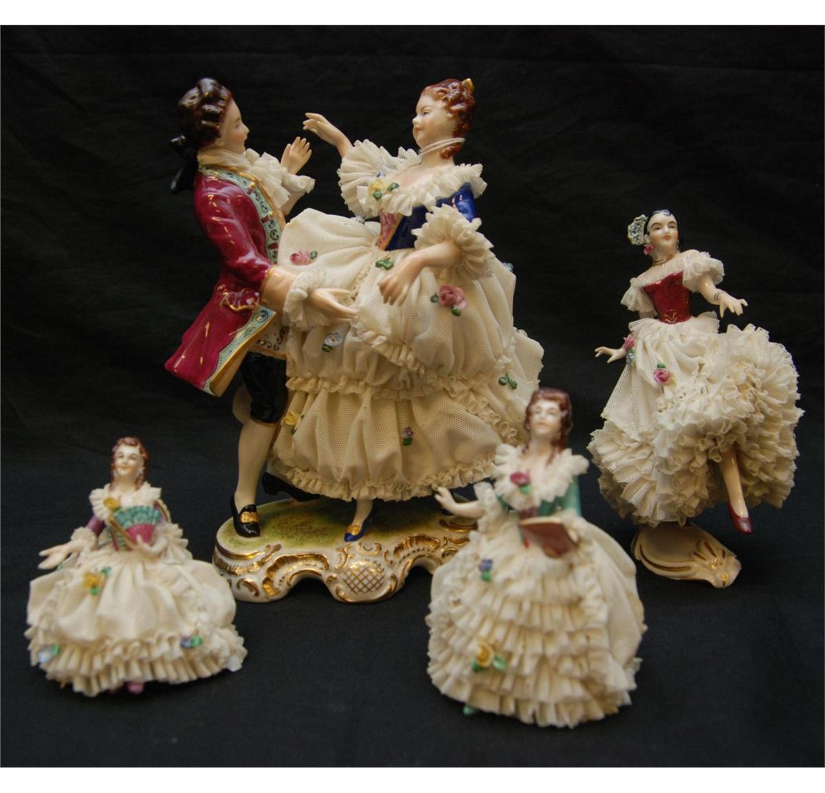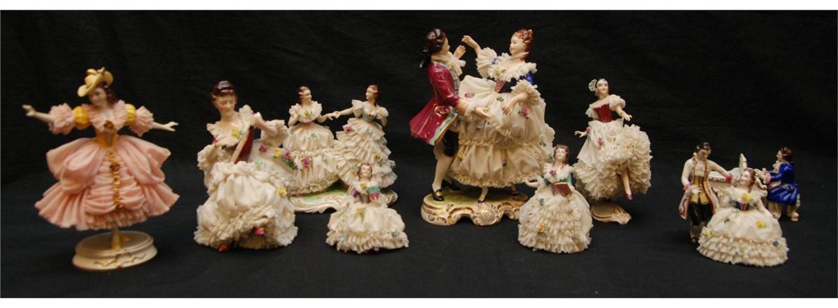 Lot of 10 Dresden German lace porcelain figurines depicting ladies and couples. Late 19th to early 20th century. Largest measures 8 1/8" height (20.6cm).