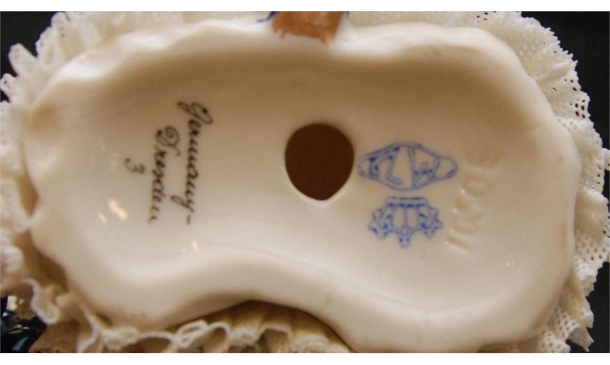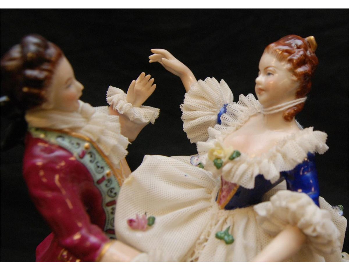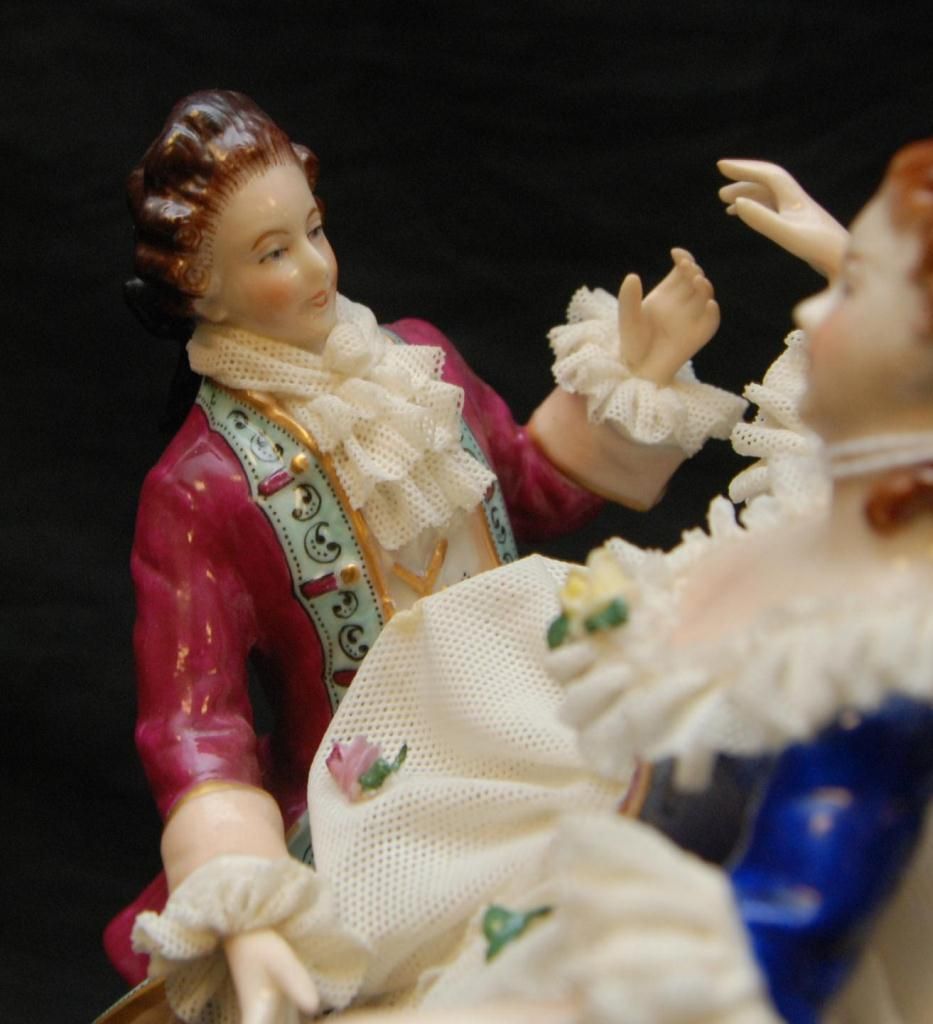 Lot of 10 Dresden German lace porcelain figurines depicting ladies and couples. Late 19th to early 20th century. Largest measures 8 1/8" height (20.6cm).