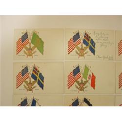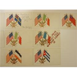 LOT OF 10 FLAG POSTCARDS FEATURING EAGLE AND THE UNITED STATES FLAG AND FOREIGN COUNTRY FLAGS. All are relief and gilt decorated. Foreign countries include: Ireland, Italy (2), Cuba, Great Britain, Germany, Sweden (2), and France (2). One is postmarked 1906, one is postmarked 1909, and one is postmarked illegibly.