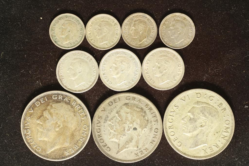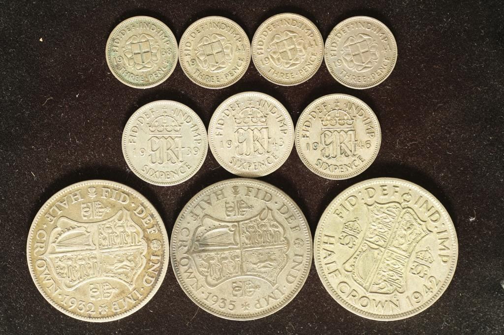 1938 & 3-1941 (3 PENCE), 1939, 1943 & 1946 (6 PENCE) AND 1932, 1935 & 1942 (HALF CROWNS). .9092 OZ. ASW TOTAL