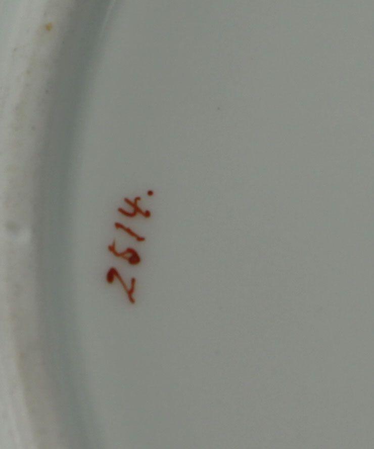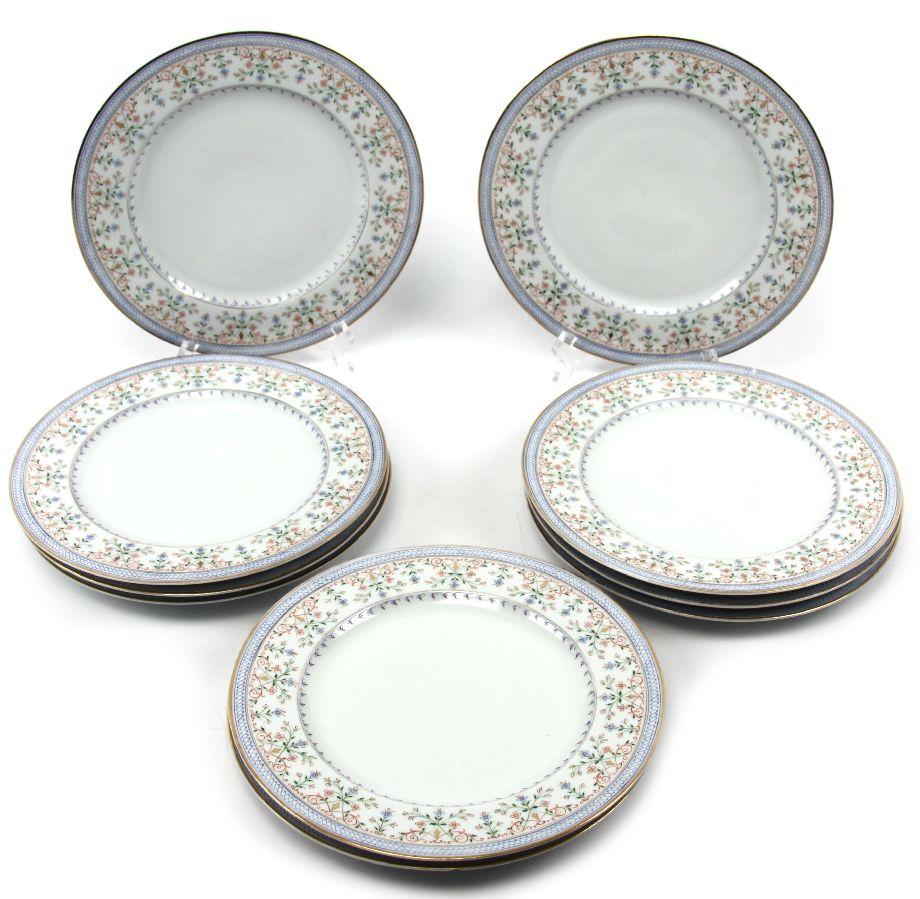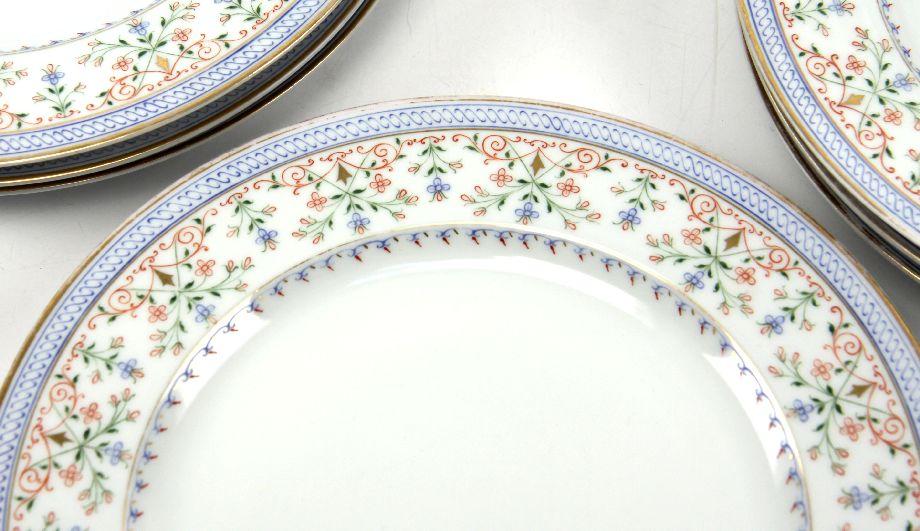 A 10 piece set of 9.5 inch diameter hand painted dinner plates with gold rim and scrolling floral design in blue, green and red. Plates are marked with artist number "2514". Very good condition with some wear to gold.