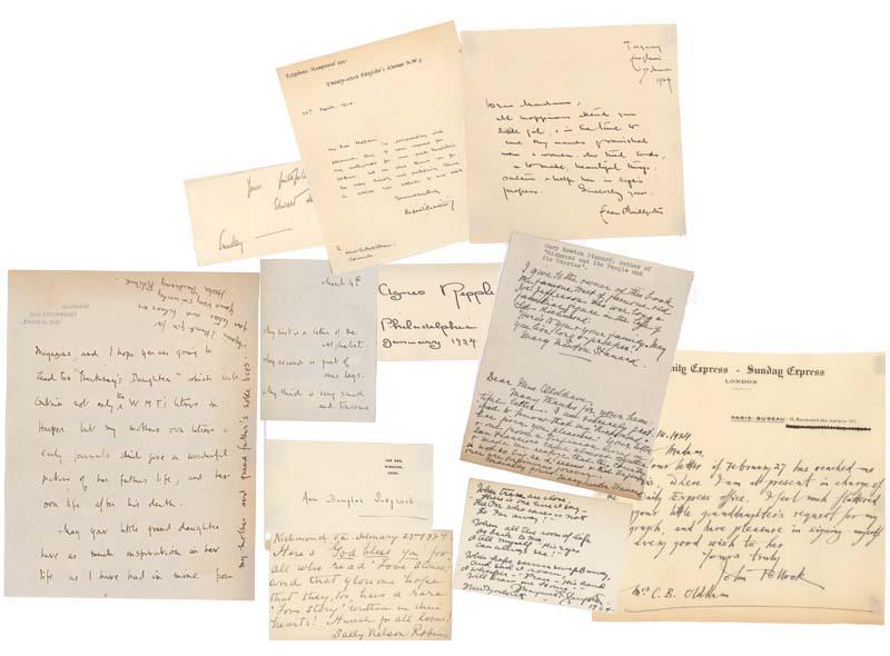 Eden Phillpots (1862 –1960), John Pollock, Agnes Repplier (1855 – 1950), Hester Thackery Ritchie (2) Sally Nelson Robins, Rafael Sabastini (1875 - 1950), Margaret E. Sangster (1838-1912), Anne Douglas Sedgwick (1873 - 1935), Edward Sheldon (1886 – 1946), Mary Newton Stanard. All generally fine or better.