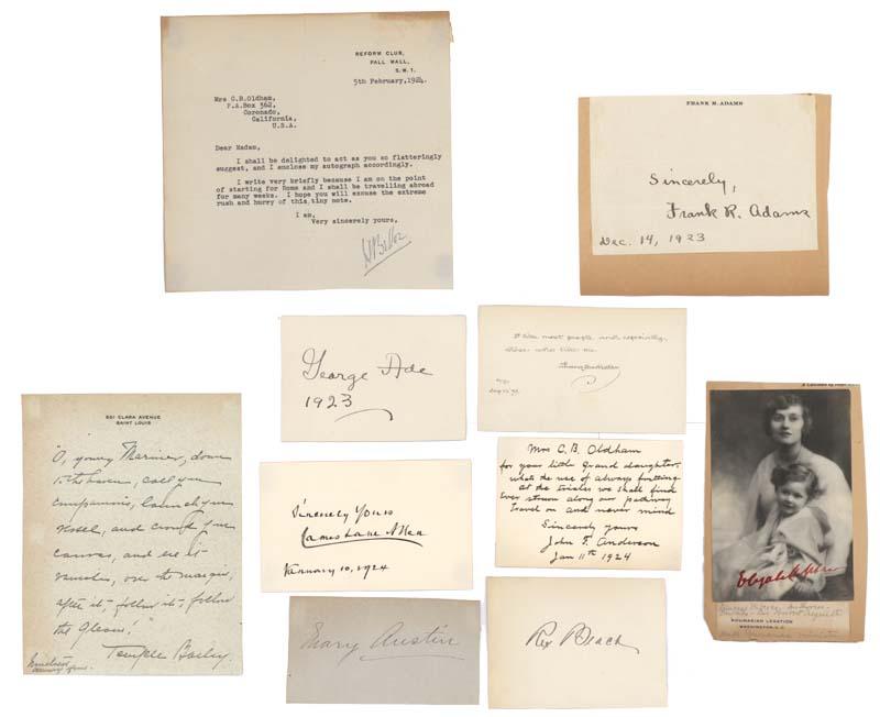 Frank R. Adams (1883 - 1963), George Ade (1866 - 1944), James Lane Allen (1849 –1925), John F. Anderson, Mary Austin (1868 –1934), Irving Bacheller (1859 –1950), Temple Bailey (c.1885 - 1953), Rex Beach (1877 –1949), Hilaire Belloc (1870 –1953), Elizabeth Bibesco (1897 - 1945). All generally fine or better.