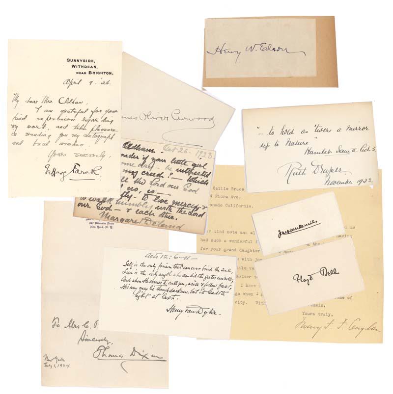 James Oliver Curwood (1878 - 1927), Josephus Daniels (1862 – 1948), Margaret Deland (1857 - 1945), Floyd Dell (1887-1969), Thomas Dixon (1878 –1952), Ruth Draper (1884 - 1956), Henry Van Dyke (1852 – 1933), Henry W. Elson, Mary Englar, Jaffrey Farnol (1878 –1952). All generally fine or better.