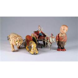 LOT OF 10 MISC. MECH. TOYS. 1) Marx walking, growling lion. 2) Suzy – ball bouncing girl. 3) Fishing boy. 4) Tin hopping frog. 5) Marx roll-over Pluto. 6) Wind-up tin Buttercup character toy. 7) Brass and tin steam engine. 8) Tonka tin jeep wagoneer. 9) Balky mule wind-up toy. 10) Marx wind-up horse-drawn wagon. SIZE: Varies. CONDITION: Averaging good. 1-2042 WP