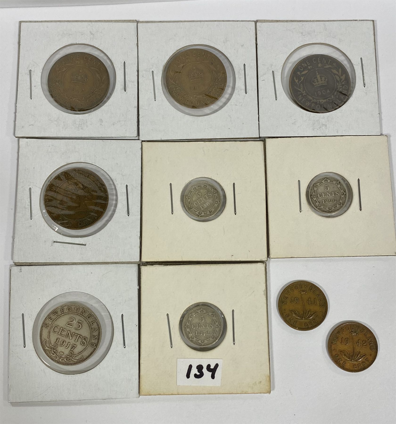 LOT OF 10 - NEWFOUNDLAND AND PRINCE EDWARD ISLAND COINS - INC: 1871 PEI CENT, 1904, 17, 17, 41, 42 NEWFOUNDLAND CENTS, 1865, 72, 96 NEWFOUNDLAND 5 CENT PIECES, & 1917 NEWFOUNDLAND 25 CENT PIECE.