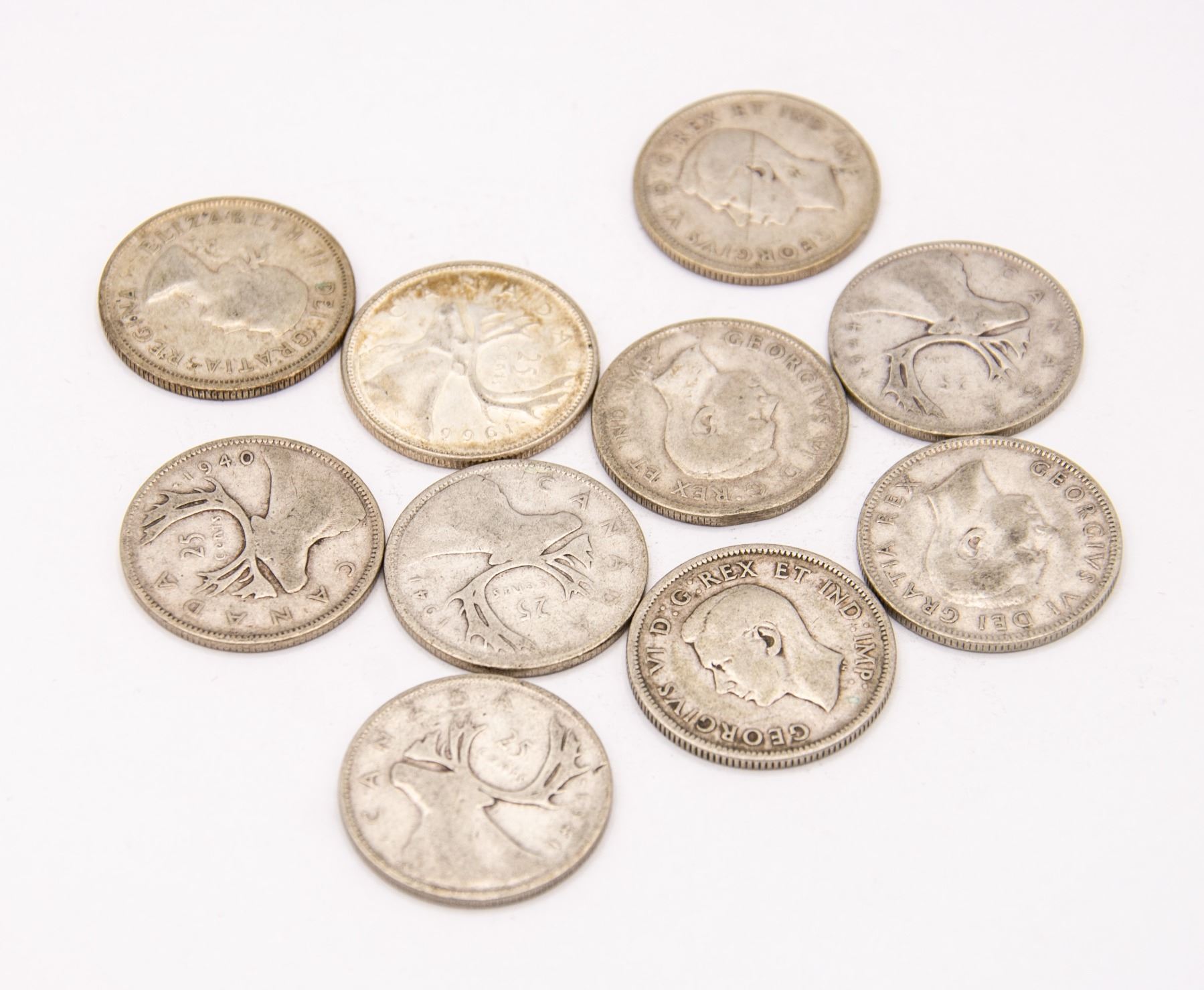 LOT OF 10 SILVER CANADIAN QUARTERS