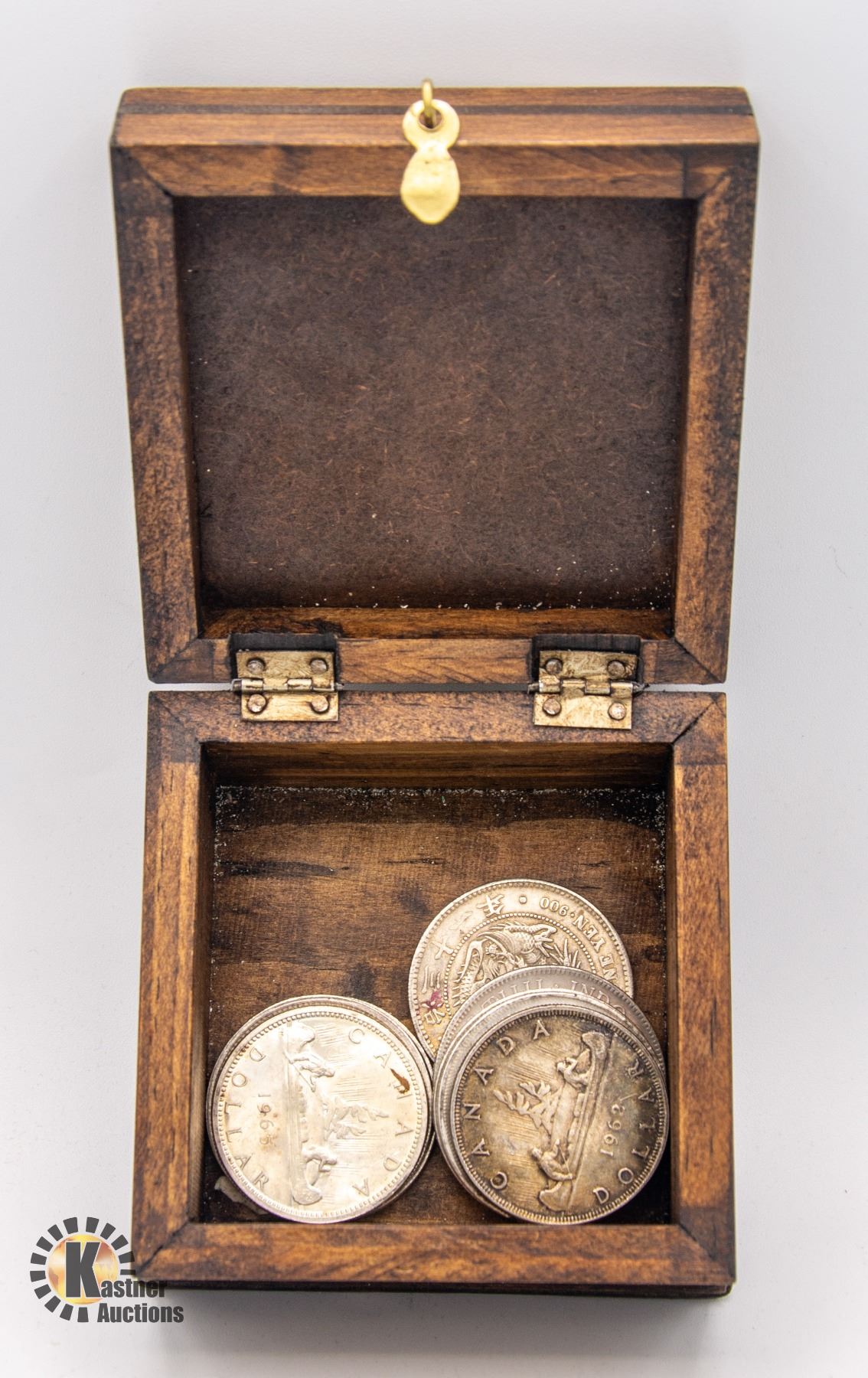 LOT OF 10 VINTAGE COINS IN BOX, SOME SILVER