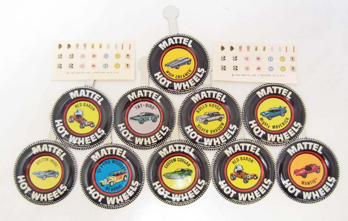 LOT OF 10 VINTAGE HOT WHEELS RED LINE BADGES & 2 DECAL SHEETS