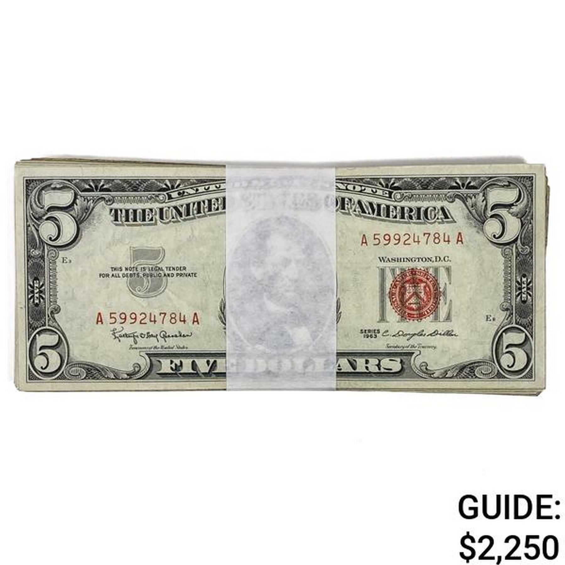LOT OF (100) 1963 $5 FIVE DOLLARS LEGAL TENDER UNITED STATES NOTES VERY GOOD - VERY FINE