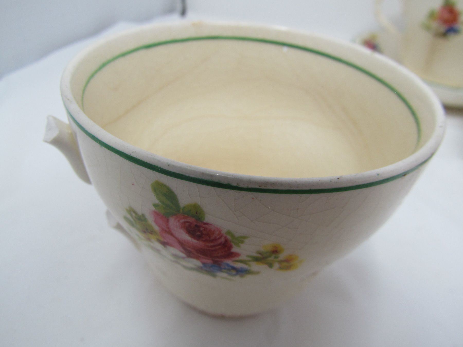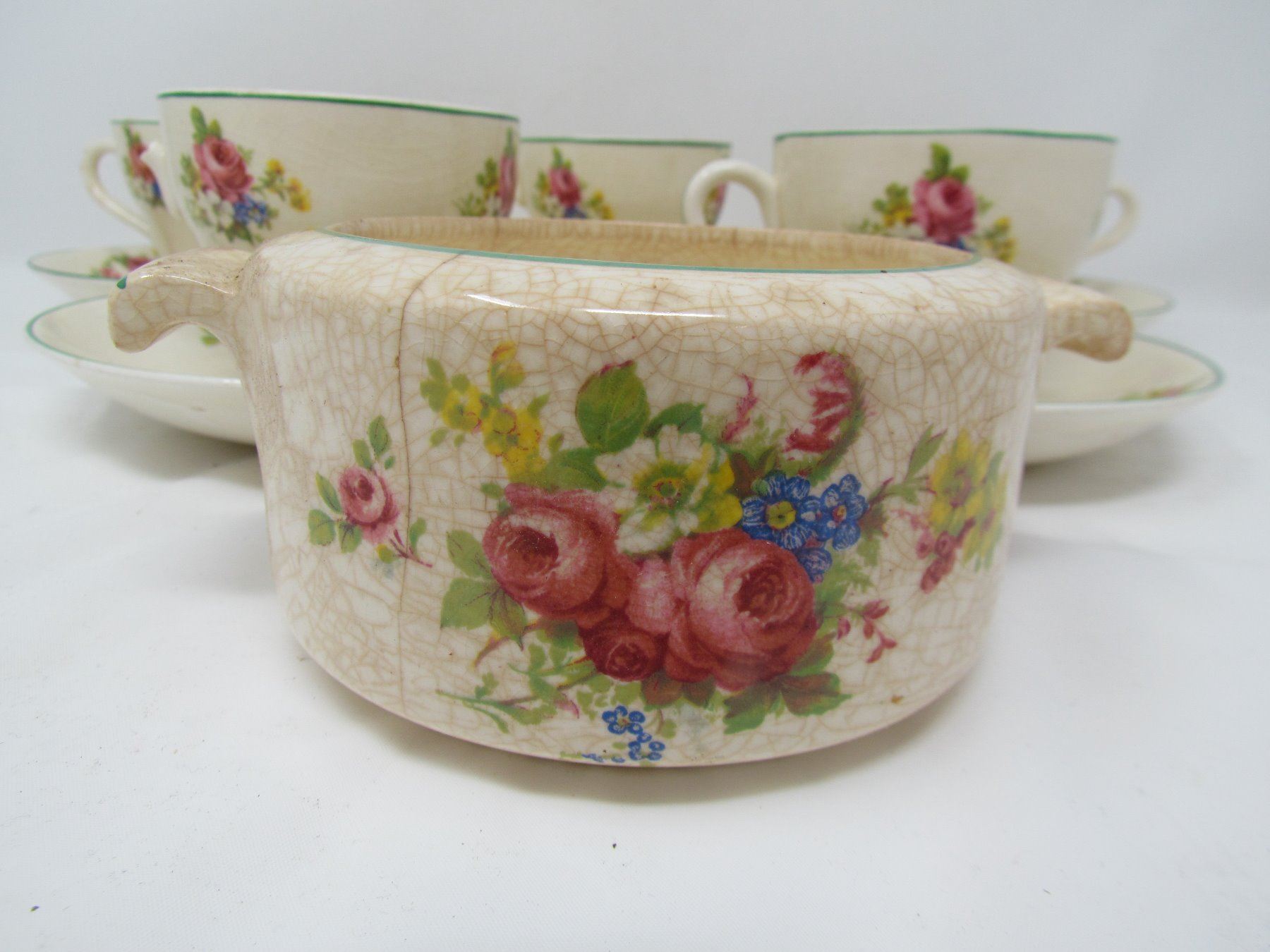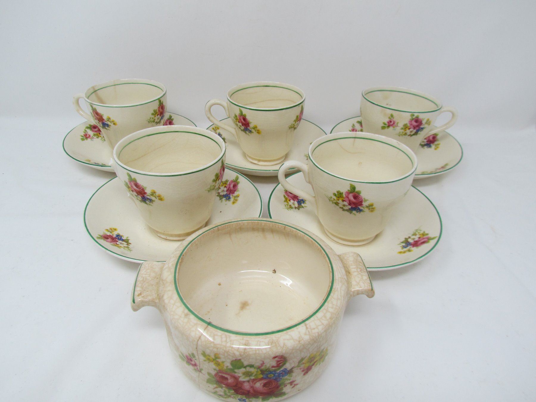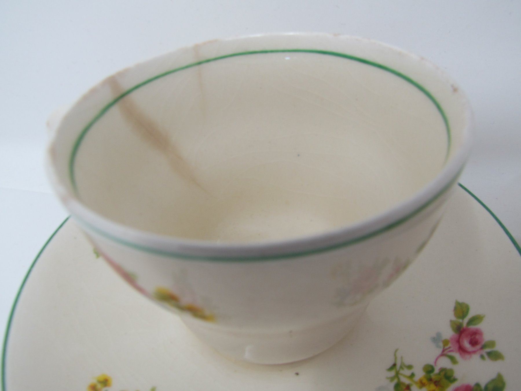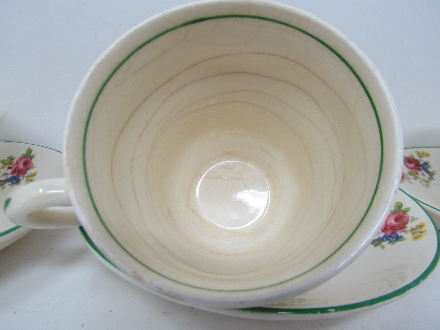 LOT OF 11 ASSORTED SAUCERS, CUPS (SOME CRACKS AND CHIPS IN FINISH, 1 BROKEN HANDLE)