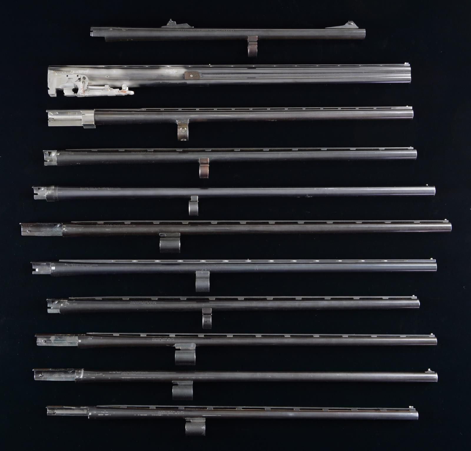 Lot consists of: 1) 4 Remington Model 870 bbls. 1 30", 2 28" (with V/R), and 1 left handed 20" (with ramped front sight and U-notch rear sight) bbl. Bbls. exhibit a blued finish overall. CONDITION: bbls. retain the majority of their original factory blue finish, exhibiting varying degrees of wear ranging from light to mild, with scattered marks from handling and storage, as well as some spots of surface oxidation. Mirror bores. 2) 4 Remington Model 1100 bbls. 2 20 gauge bbls. with V/R measuring 25 5/8" and 27 7/8" in length. 2 12 gauge bbls. measuring 30 1/8" (with V/R) and 28". CONDITION: bbls. retain the majority of their original factory blue finish, exhibiting varying degrees of wear and thinning, ranging from light to mild, with scattered marks from handling and storage, and some small spots of light surface oxidation. Mirror bores. 3) 1 29 7/8" Smith & Wesson Model 1000 12 gauge bbl. Blued finish with V/R and aluminum bead front sight. CONDITION: good, with the bbl. retaining the majority of its original factory blue finish, exhibiting some light wear, with scattered superficial marks from handling and storage. Mirror bore. 4) 1 25 5/8" Belgian Browning Model A-5 bbl. Blued finish with V/R and aluminum bead front sight. Belgian proofs on left with "MADE IN BELGIUM" on right. CONDITION: bbl. retains the majority of its original factory blue finish, exhibiting areas of mild wear and thinning with some scattered superficial marks from handling and storage. Mirror bore. 5) 1 28" Belgian Browning Superposed 20 gauge O/U bbl. Blued finish with V/R and white plastic bead front sight. Bbls. exhibit scattered areas of moderate pitting that are likely the result of salt wood, and appear to have cleaned via glass beading in pitted areas. CONDITION: metal components retain large amounts of their original factory blue finish, exhibiting losses from the aforementioned glass beading with scattered areas of moderate pitting and some areas of surface oxidation. Mirror bores. (02-20873-1/MLW). $1,000-2,000.