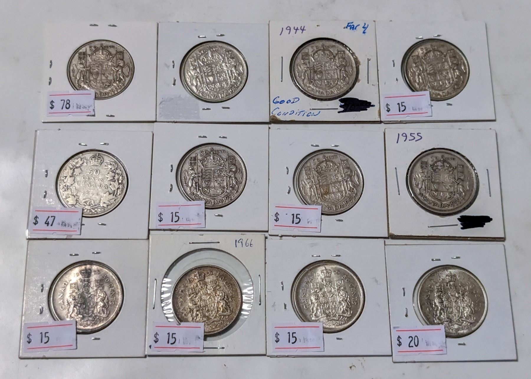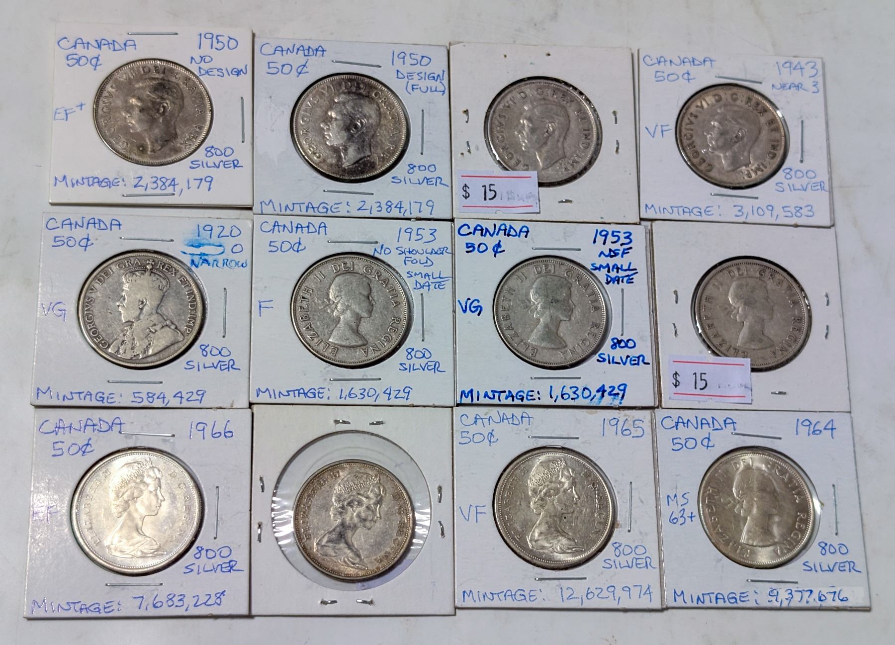 LOT OF 11 CANADA 50 CENT SILVER COINS 1920-1966