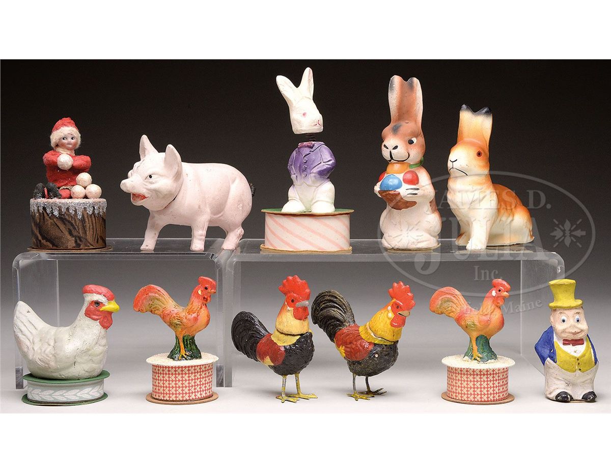 All of these candy containers are hand painted papier mache/composition material. Lot includes 1) & 2) Two standing roosters with lead feet. Head removes to reveal candy enclosure. 3 & 4) Two composition roosters standing on cardboard candy containers with mica snow-like surface. Both are marked "Germany". 5 & 6) Two rabbit compo figures with airbrushed highlights. Sitting variation shows enclosure cover reading "U.S. Zone Germany". Standing rabbit figure holds depicted eggs. 7) Small bisque hand painted figure resembles English comic character. Marked "Germany". 8) Child figure holding snowballs sits above tree trunk. Head to body originality is questionable. 9) Composition German made pig with removable head and hand painted facial features. Coiled wire tail. 10) Composition nodding head rabbit sits atop cardboard candy container. Air brushed features. 11) Hand painted compo hen sits atop cardboard container marked "Germany". SIZE: Largest is 5-1/2" t. CONDITION: Good to very good unless otherwise stated above. 1-13283