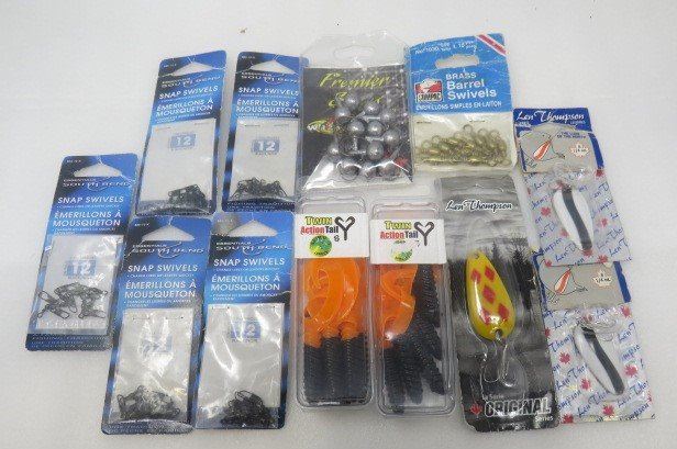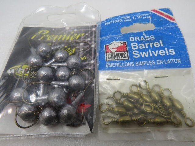 LOT OF 11 FISHING ITEMS (5 X SNAP SWIVEL) *2 X TWIN ACTION TAIL* (1 BRASS BARREL SWIVEL) *2 X LEN THOMPSON 1/4 OZ LURES* (1 JIGHEAD)