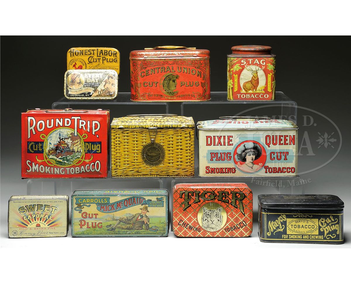 1) Central Union Cut Plug lunch pail tin; 2) Dixie Queen Plug Cut lunch pail tin; 3) Patterson's Seal Cut Plug lunch pail tin; 4) Round Trip Cut Plug lunch pail tin with hinged front and back lids; 5) "Mick McQuaid" hinged lid; 6) Stag Tobacco canister; 7) Tiger Chewing Tobacco hinged lid; 8) Mayo's Cut Plug hinged lid; 9) Every day Cut Plug hinged lid; 10) Honest Labor Cut Plug hinged lid; 11) Sweet Caporal hinged lid. SIZE: 1) 7" w x 4-1/4" t x 4-1/2" d; 2) 7-3/4" w x 4" t x 5" d; 3) 6-1/2" w x 4-1/4" t x 5" d; 4) 6-1/2" w x 4" t x 5" d; 5) 7-3/8" w x 1-1/2" t x 3-5/8" d; 6) 4" w x 4-1/2" t x 4" d; 7) 6" w x 2-1/8" t x 3-3/4" d; 8) 6" w x 3" t x 3-3/4" d; 9) 4-1/2" w x 3/4" t x 2-5/8" d; 10) 4-1/2" w x 7/8" t x 2-1/2" d; 11) 4-1/4" w x 1-1/2" t x 3" d. CONDITION: 1) Very good to excellent; 2) Near excellent; 3) Near excellent; 4) Very good to excellent; 5) Very good; 6) Good to very good; 7) Very good to excellent; 8) Near excellent; 9) Very good with oxidation to sides and paint chips; 10) Near excellent; 11) Very good to excellent. 1-13226-35