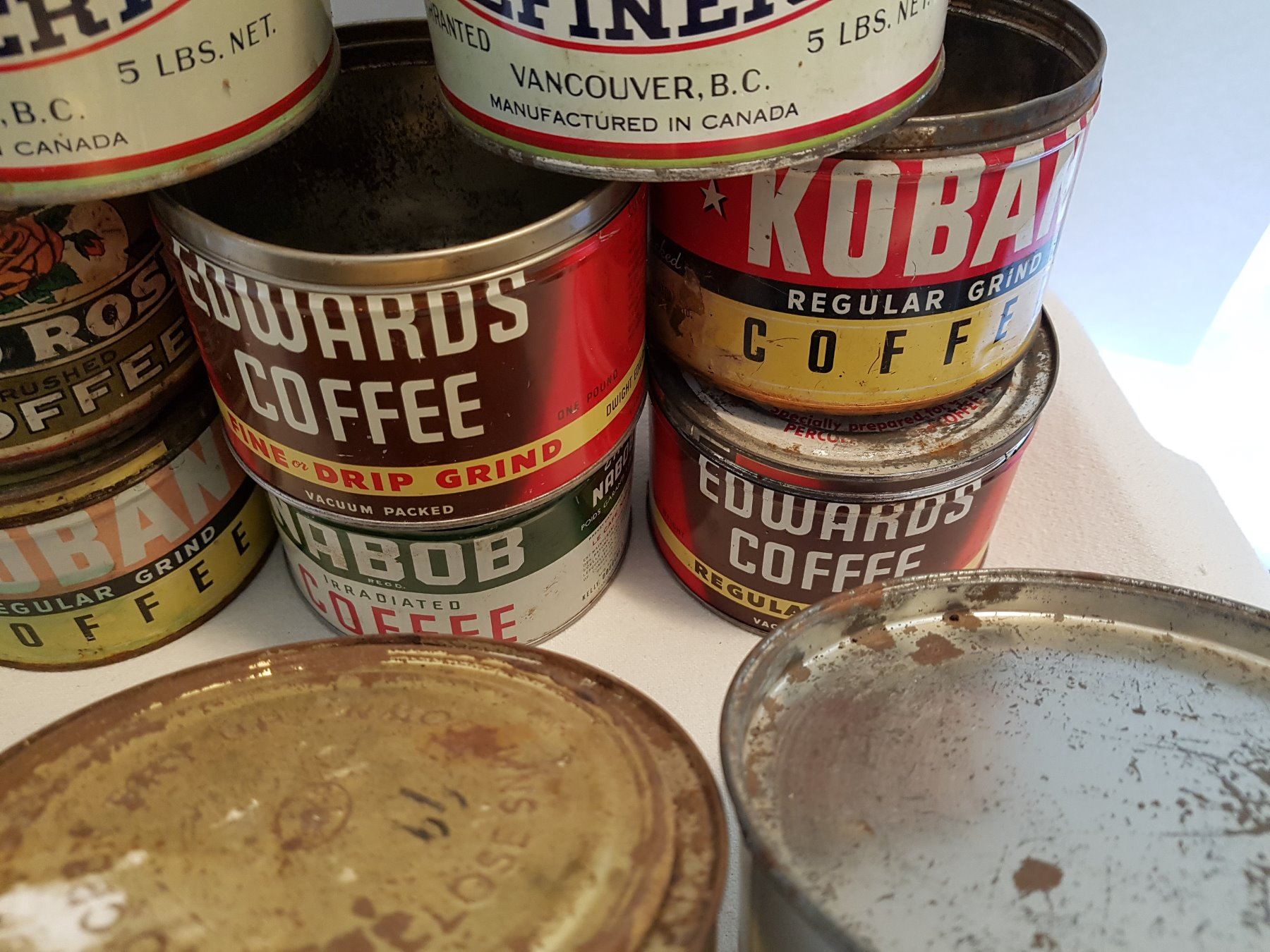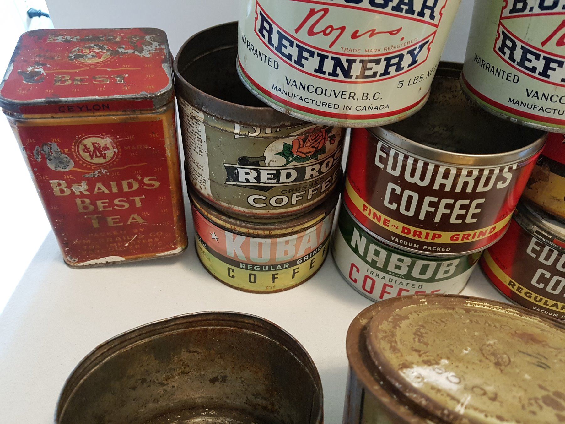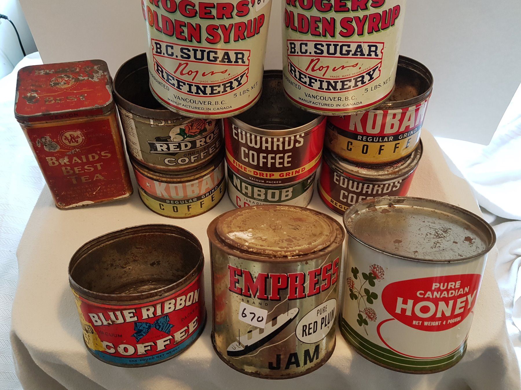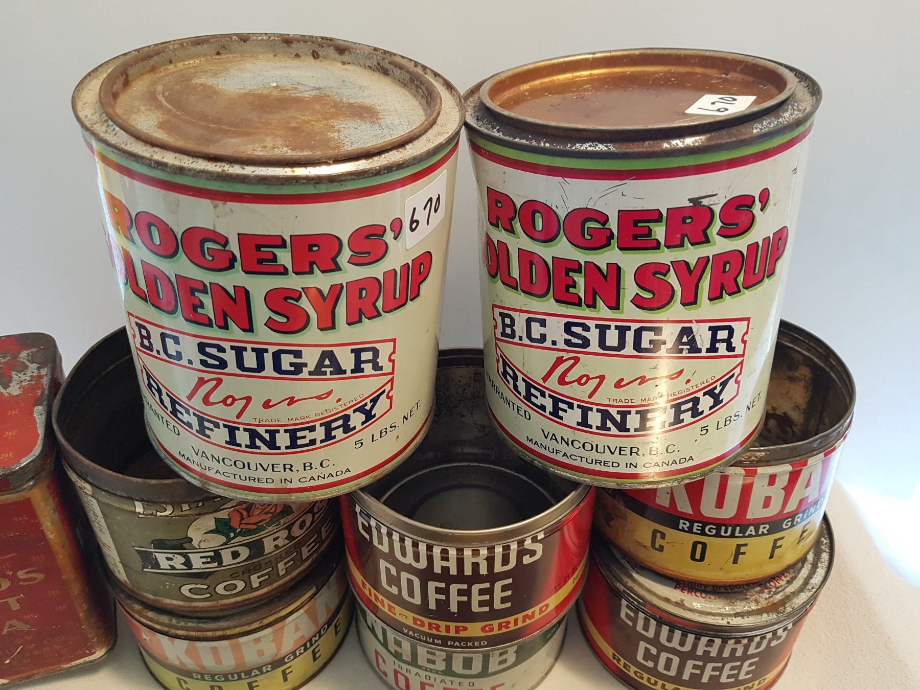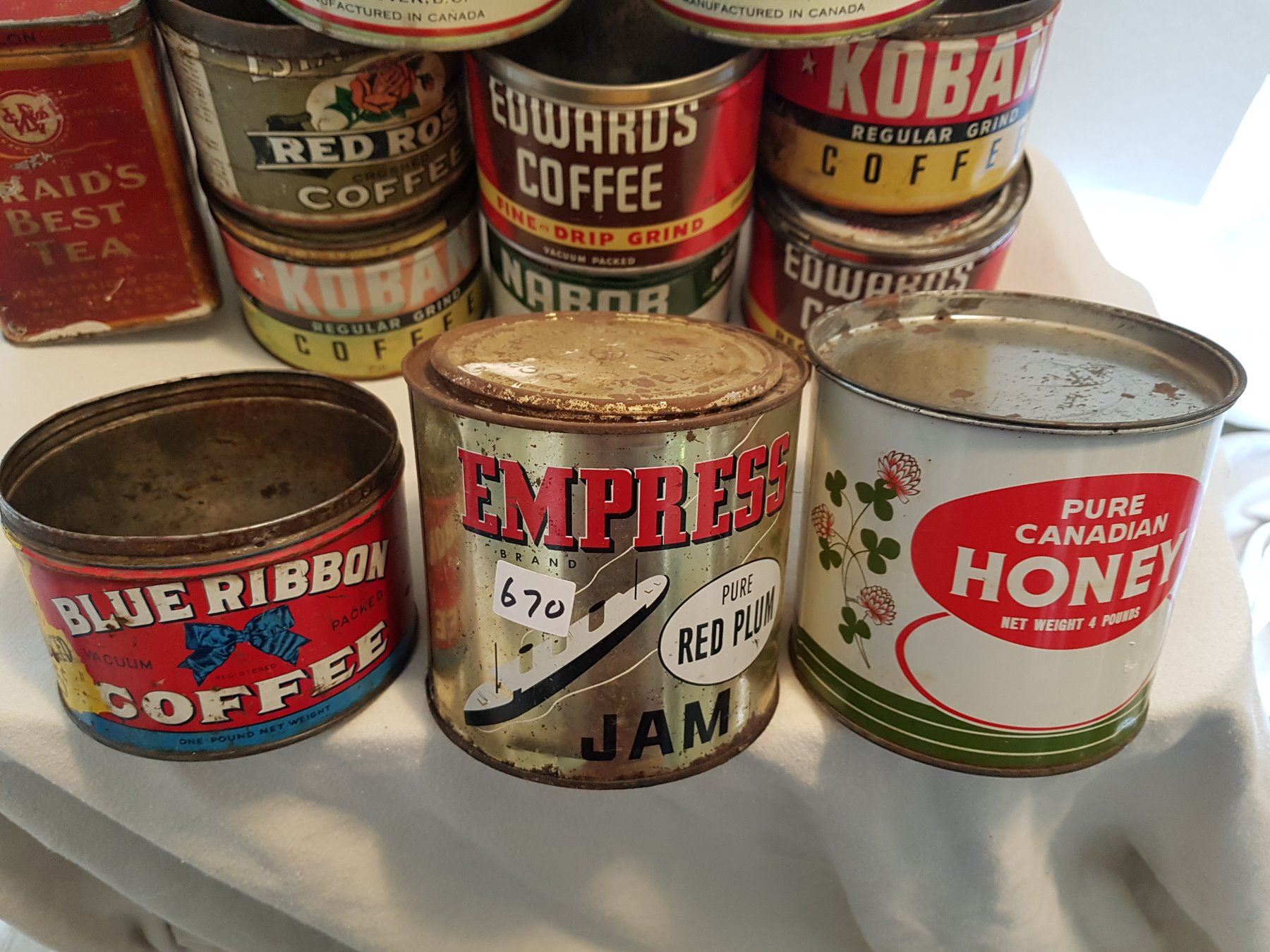LOT OF 12 ASSORTED TINS (COFFEE, SYRUP, JAM, HONEY)
