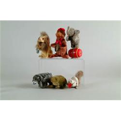 Lot # 1049 LOT OF 12 PLUSH OVER TIN W/UP TOYS. 1) Cymbal playing monkey. Japan. 2) Bear riding donkey. Japan. 3) Growling lion. Linemar, Japan. 4) Walking polar bear with cub. Japan. 5) Hopping frog. West Germany. 6) Spinning tail donkey. Japan. 7) Growling lion. Beer drinking variation of one above. 8) Hopping squirrel. Japan. 9) Performing elephant by S&E, Japan. 10) Paw licking lion by Linemar, Japan. 11) Performing seal. West Germany. 12) Performing duck. West Germany. SIZE: Largest is 8-1/2" h. CONDITION: Averaging good to very good and working. 1-29396 (200-400)