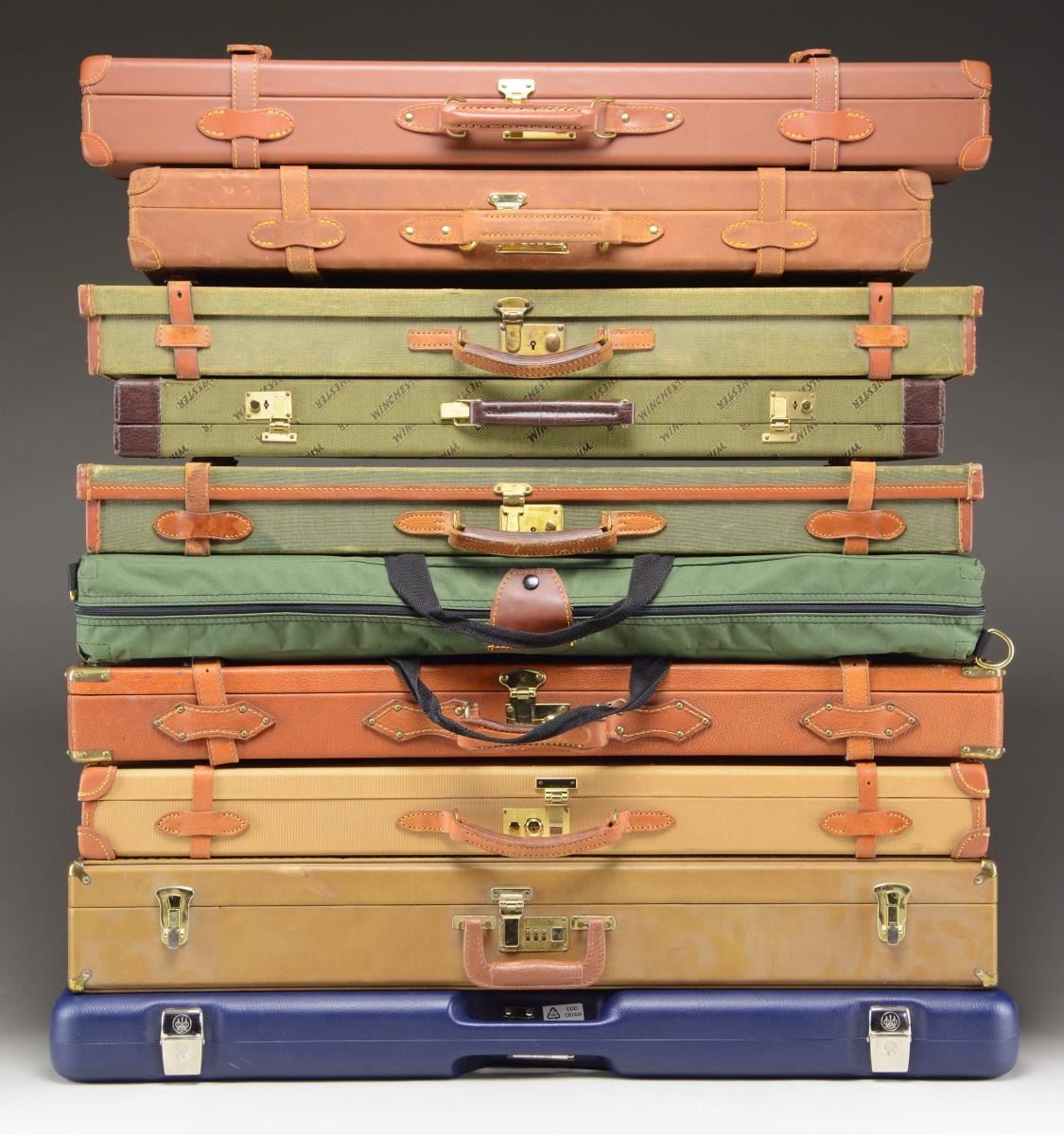 1) Brown leather wrapped case with brass corners. Interior exhibits a green felt lining and a "VENATOR" tag on the interior of the lid. Dimensions: L: 34 1/8", W: 9 5/8", D: 3 1/4". CONDITION: exterior exhibits scattered marks from handling and storage, but otherwise is good overall. Interior shows some mild wear, but otherwise is good overall. 2) Brown leather wrapped case with brown leather padded corners. Interior exhibits a red felt finish, with the interior of the lid exhibiting a leather label for a Winchester Model 21 SxS shotgun. Case contains a section wood cleaning rod, 4 cleaning brushes, an oiler, as well as 2 20 GA snap caps, which fit loosely in their cutouts. Dimensions: L: 32 1/4", W: 8 1/4", D: 3 1/2". CONDITION: very good overall, with little wear externally or internally. 3) Brown leather wrapped case for a drilling/double rifle by Jeff's Outfitters. Lid exhibits leather padded corners. Interior exhibits a red felt finish. Dimensions: L: 28 5/8", W: 10 1/2", D: 3 3/8". CONDITION: exterior of case shows mild wear from storage and handling. Interior shows some light wear, but is otherwise good. 4) Green canvas wrapped shotgun/rifle case. Interior features a burgundy colored felt lining. Dimensions: L: 32 3/4", W: 8 1/2", D: 3". CONDITION: exterior exhibits wear from handling and storage, with some crazing to leather. Interior exhibits mild wear, with some loosening of compartment walls. 5) Brown leather shotgun case with decorative floral tooling on exterior. Interior features a green felt lining. Dimensions: L: 34 3/4", W: 9 1/2", D: 3 1/4". CONDITION: exterior exhibits mild wear, with tooling remaining clear and visible. Interior is good overall. 6) Green canvas wrapped shotgun case by Brady in Halesowen, England. Interior features a green felt lining, with a Brady tag on the interior of the lid. Dimensions: L: 32 5/8", W: 8 5/8", 3 1/2". CONDITION: exterior exhibits moderate wear, with some fraying to the canvas wrap in some areas. Interior exhibits mild wear. 7) Brown leather wrapped case produced for a Winchester Model 21 SxS shotgun. Exterior features brown leather padded corners. Interior features a red felt lining with 2-provisions for bbls. Interior of lid exhibits a leather Winchester Model 21 label. Case is housed within a green canvas transit bag. Dimensions: L: 32 1/4", W: 11 3/8", D: 3 1/4". CONDITION: exterior and interiors are both very good overall. 8) Yellow canvas wrapped shotgun case. Interior features a black felt lining. Dimensions: L: 32 7/8", W: 9 1/4", D: 3 1/8". CONDITION: exterior exhibits some light wear. Interior is good overall. 9) Browning leather wrapped Winchester shotgun case. Interior features a yellow "fur" lining. Dimensions: L: 33 3/4", W: 9 1/2", D: 4 1/2". CONDITION: case exhibits mild exterior wear, with some oxidation the metal components. Interior exhibits mild wear. 10) Blue plastic Beretta shotgun case with foam padded interior. Dimensions: L: 35 1/4", W: 13 3/8", D: 3 1/4". CONDITION: case exhibits some mild exterior wear, but is otherwise good overall. 11) Brown leather wrapped case for a drilling/double rifle by Jeff's Outfitters. Lid exhibits leather padded corners. Interior exhibits a red felt finish. Dimensions: L: 28 5/8", W: 10 1/2", D: 3 3/8". CONDITION: exterior exhibits some marks from handling and storage, but case is otherwise good overall. 12) Green Winchester trademark logo canvas wrapped shotgun case. Interior features a brown fabric lining. Dimensions: L: 30", W: 9 3/4", D: 2 3/4". CONDITION: exterior exhibits mild wear from handling and storage, with some spots of mild tearing to the canvas. Exterior of lid exhibits water staining. Interior is good overall. 13) Brown leather wrapped 2-shotgun, 4-bbl. case. Brown leather grip straps. Interior exhibits a brown felt lining. Case is contained within a green canvas carrier. Dimensions: L: 35 1/4", W: 7 1/4". D: 6 1/8". CONDITION: exterior of case shows some mild wear, with patina present on brass components. Interior is good overall. 14) Reproduction black leatherette case for an Auto Ordnance Thompson carbine. Interior features a blue felt lining. Dimensions: L: 32 3/4", W: 5 1/4", D: 9 3/4". CONDITION: good, with some mild wear overall. PROVENANCE: The Collection of Gun Sport Ltd owned by Jon R. Thomas. (02-20871/MLW). $1,000-2,000.