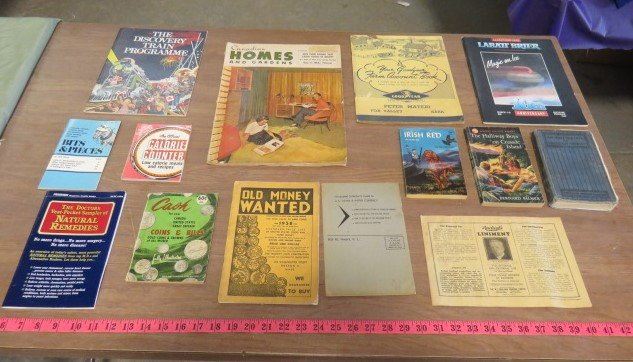 LOT OF 14 BOOKS (VINTAGE) *3 X CURRENCY COLLECTOR BOOKS, NATURAL REMEDIES, CALORIE COUNTER, CANADIAN HOMES AND GARDENS OCT 1953, ETC*