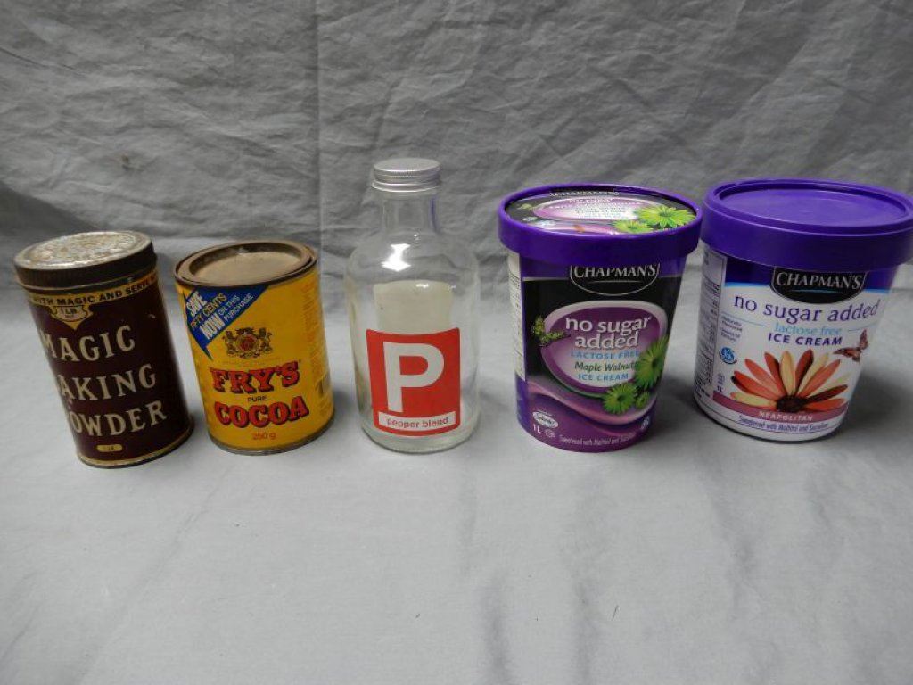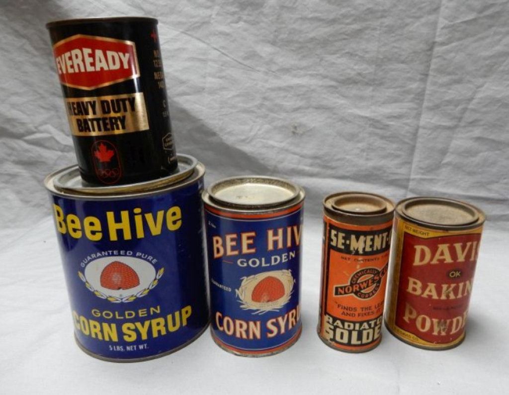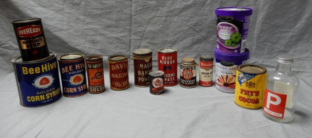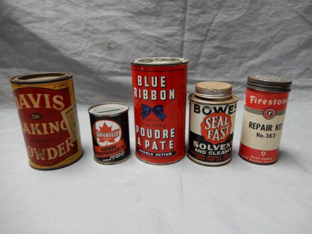 LOT OF 14 COLLECTIBLES EVEREADY & SUPERTEST COIN BANKS TIRE REPAIR, RADIATOR SOLDER, SEALFAST, CORN SYRUP, BAKING POWDER, COCOA & PEPPER BLEND LOCATION: UPPER OFFICE