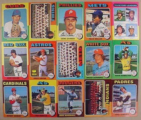LOT OF 15 1975 TOPPS BASEBALL CARDS - Incl. Minnesota Twins Team, NY Mets Team, Greg Gross Rookie, Dick Drago, Cleveland Indians Team, Ted Kubiak, Victory Leaders w/ Jim "Catfish" Hunter, More!