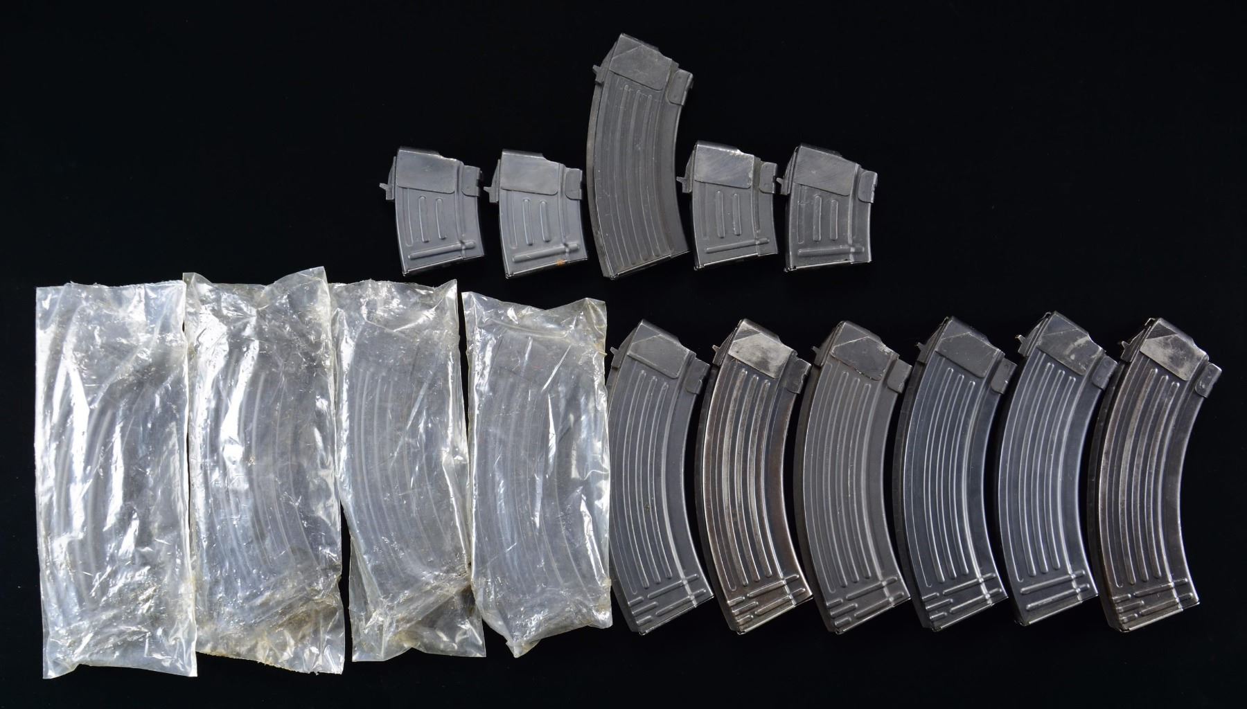 This lot consists of the following AK-47/AKM style mags housed in two USGI 50 cal ammo cans: 1) Four 10 rd. mags marked "CHINA" on their floorplates. 2) One 20 rd. unmarked mag possibly from Hungary. 3) Ten varied 30 rd. mags. that appear unmarked. CONDITION: mags generally appear serviceable with some showing oxidation & others being new in wrapper. (02-23233-5/MJC). $200-300.
