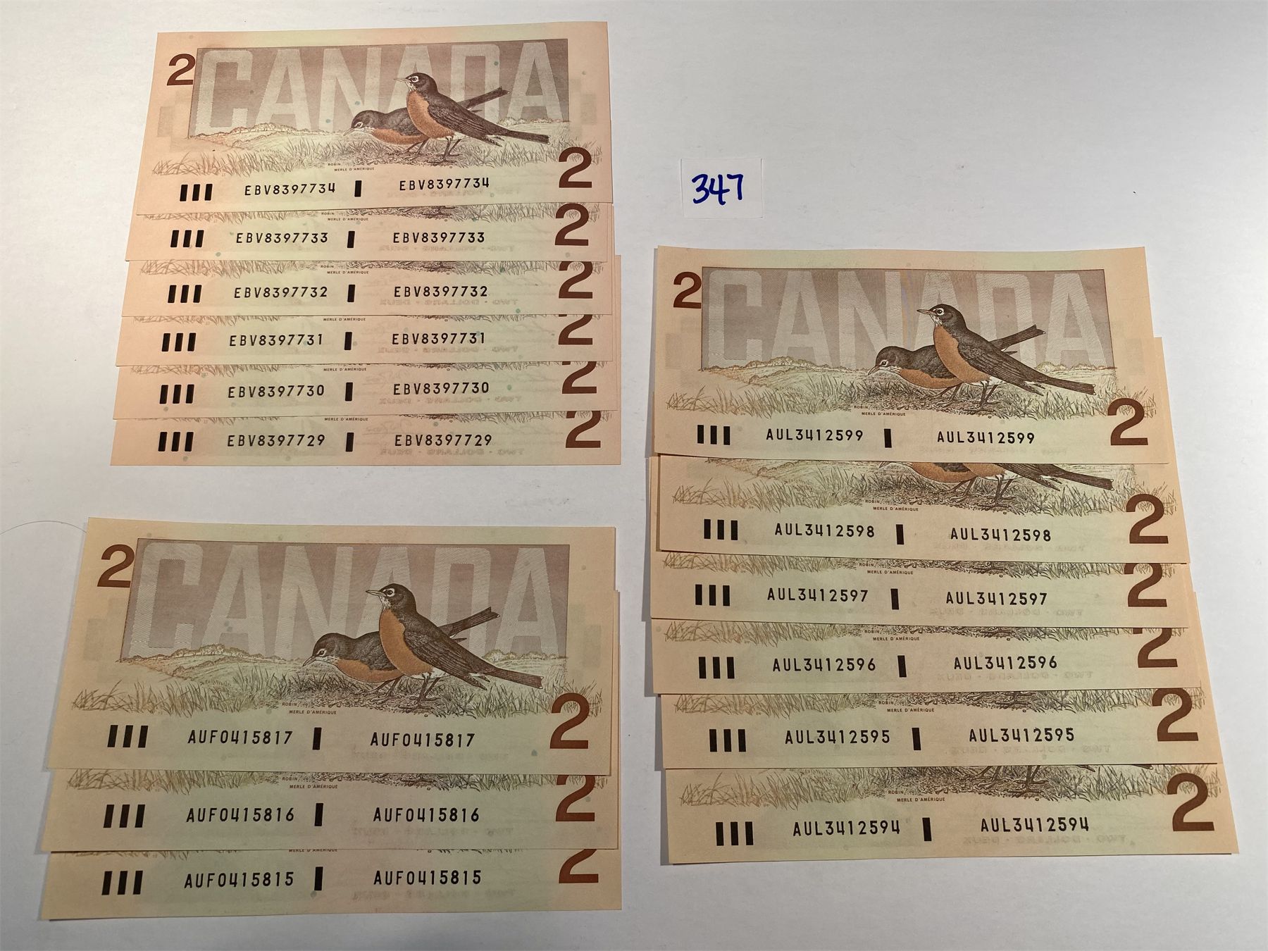 LOT OF 15 TWO DOLLAR BILLS - 3 CONSECUTIVE GROUPS - ALL ARE UNCIRCULATED