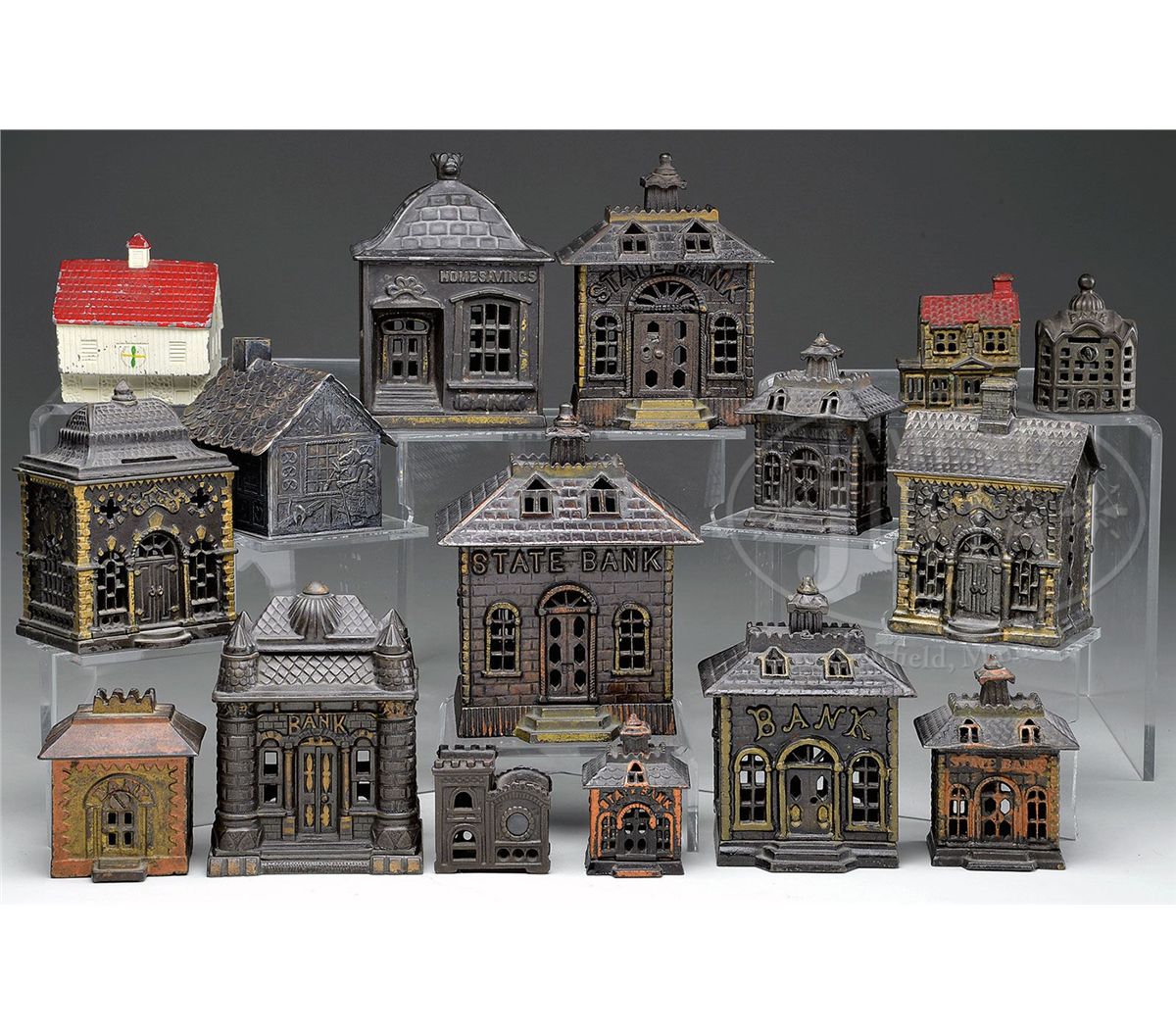 1, 2, 3, & 4) Four smaller 3" cast iron banks. #1 is a house, other three are bank buildings. 5 & 6) Two similar 5-1/2" cast iron building banks. Both are marked "BANK". 7, 8, & 9) Three similar 4-1/4" cast iron banks. Two are marked "STATE BANK". 10, 11, 12, & 13) Four similar sized bank buildings (6"). One has mechanical locked front door, another reads "HOME SAVINGS BANK". 14) Silver plated tin bank marked "Denmark". Depicts Hansel and Gretel's candy house. 15) Cast iron Barn Bank with very good original paint in red and white. 16) The largest building bank, 7" tall, marked "STATE BANK". SIZE: Tallest 7". CONDITION: No breaks, chips, or cracks. Finish averages good to very good with #16 being near excellent. 1-13398