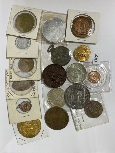 LOT OF 17 ASSPRTED TOKENS AND MEDALLIONS - INC: 1924 BRITISH EMPIRE EXHIBITION, 1933 CHICAGO FAIR, LONDON TOBACCO TRADE TOKEN, HOOVER GOOD LUCK COIN, 1879 EXHIBITION, TORONTO INDUSTRIAL EXHIBITION MEDALLION, ETC.